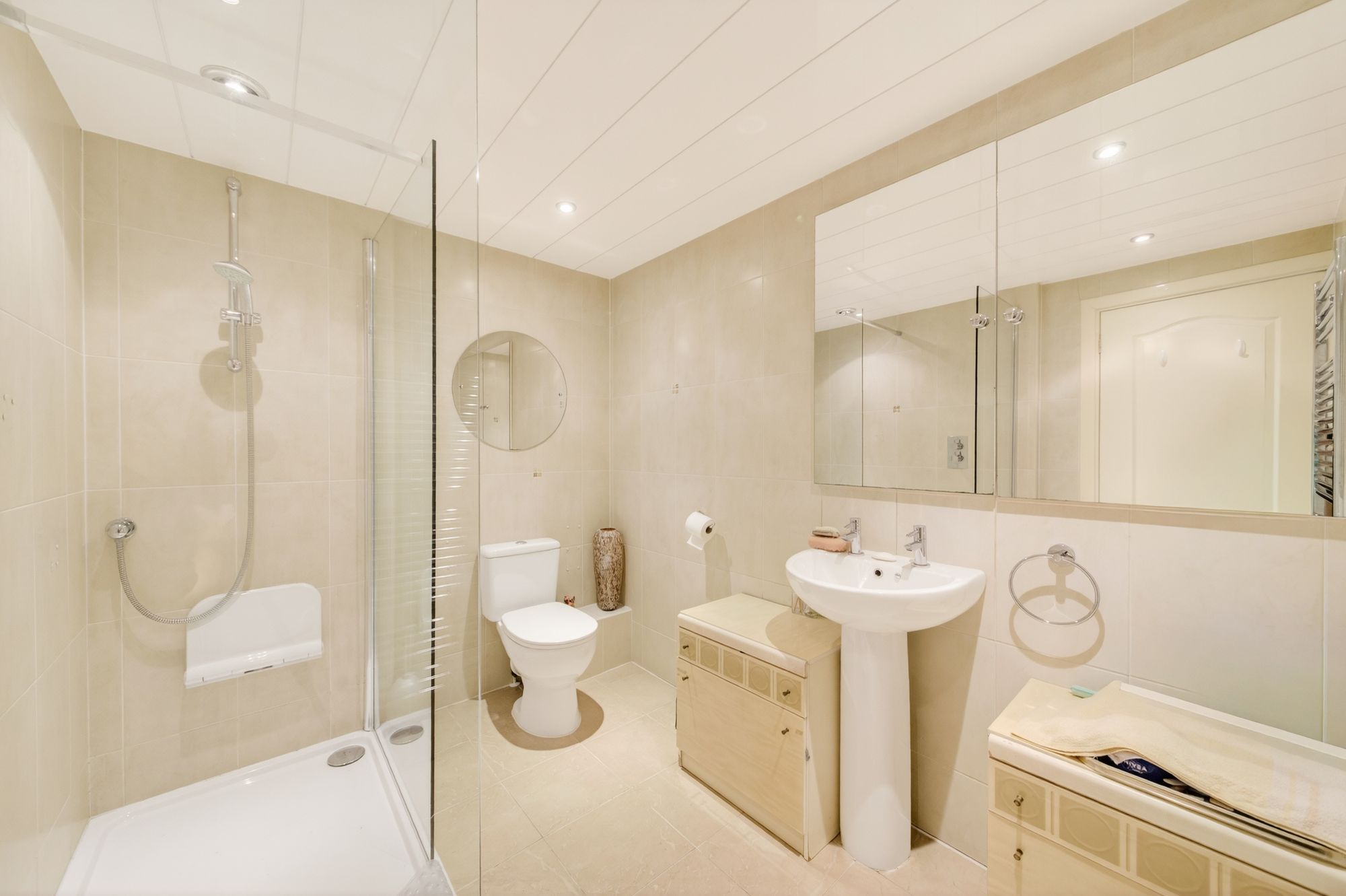The bathroom features a modern white three piece suite which comprises of a fixed frame walk-in shower with thermostatic shower attachment, a low-level W.C. with push button flush and a pedestal wash hand basin with chrome taps. There is tiled flooring and contrasting tiling to the walls, a panelled ceiling with inset spotlighting and extractor vent, a chrome ladder style radiator and a large in-built vanity cupboard with mirrored doors providing ample space for toiletries.