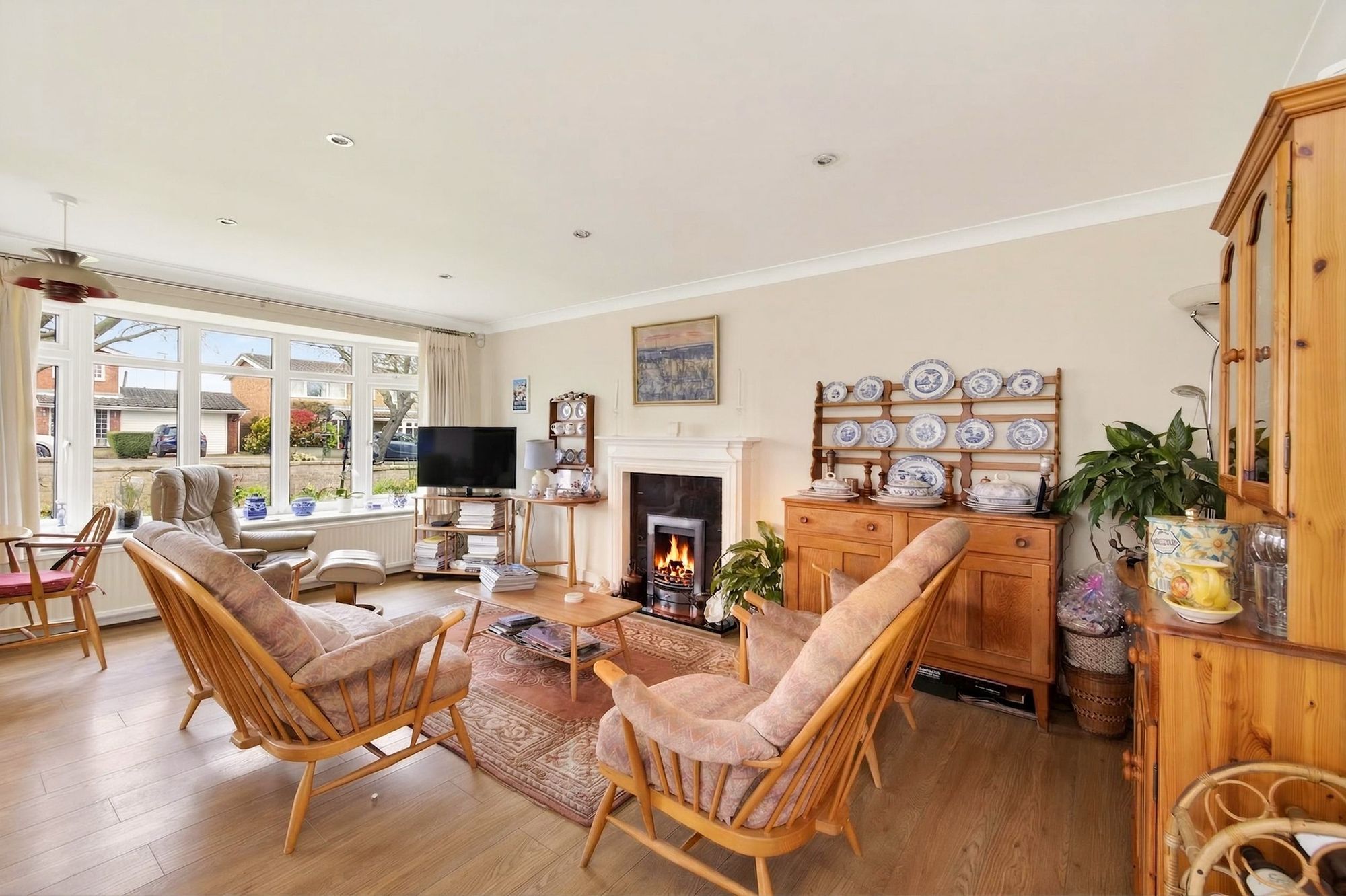 The dining/family area has a living flame effect gas fireplace with an attractive inset and hearth and ornate mantel surround. There is a double glazed composite door with obscure glazed inserts and leaded detailing to the side elevation.