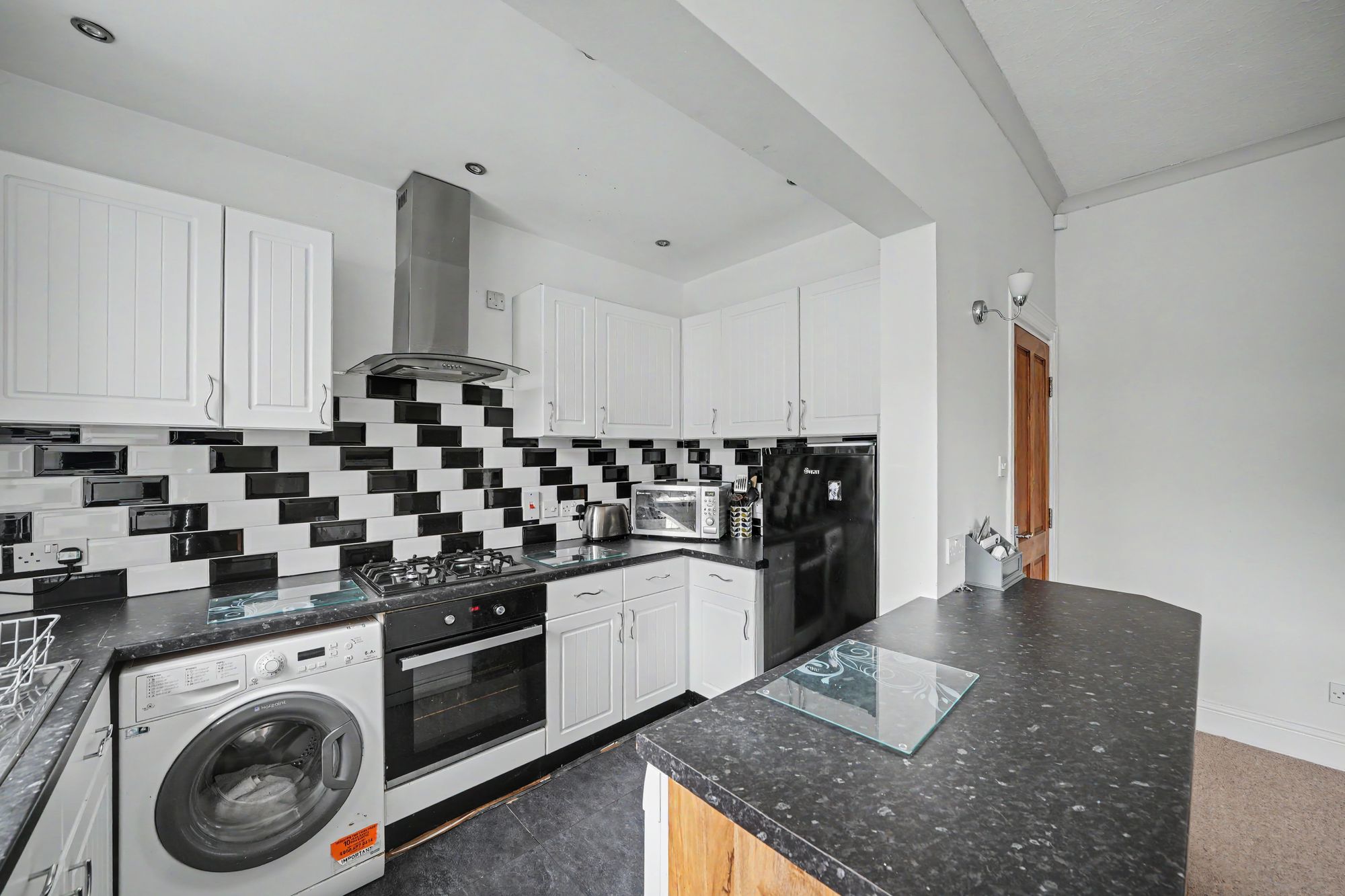 With a uPVC double glazed window looking out into the rear garden, there are inset ceiling downlighters and fitted with a range of matt white base and wall cupboards, drawers, contrasting overlying worktops with tiled splashbacks, inset single drainer stainless steel sink with chrome mixer tap, four ring gas hob with stainless steel and curved glass extractor hood over and electric oven beneath together with under counter space for washing machine, dishwasher and fridge freezer.