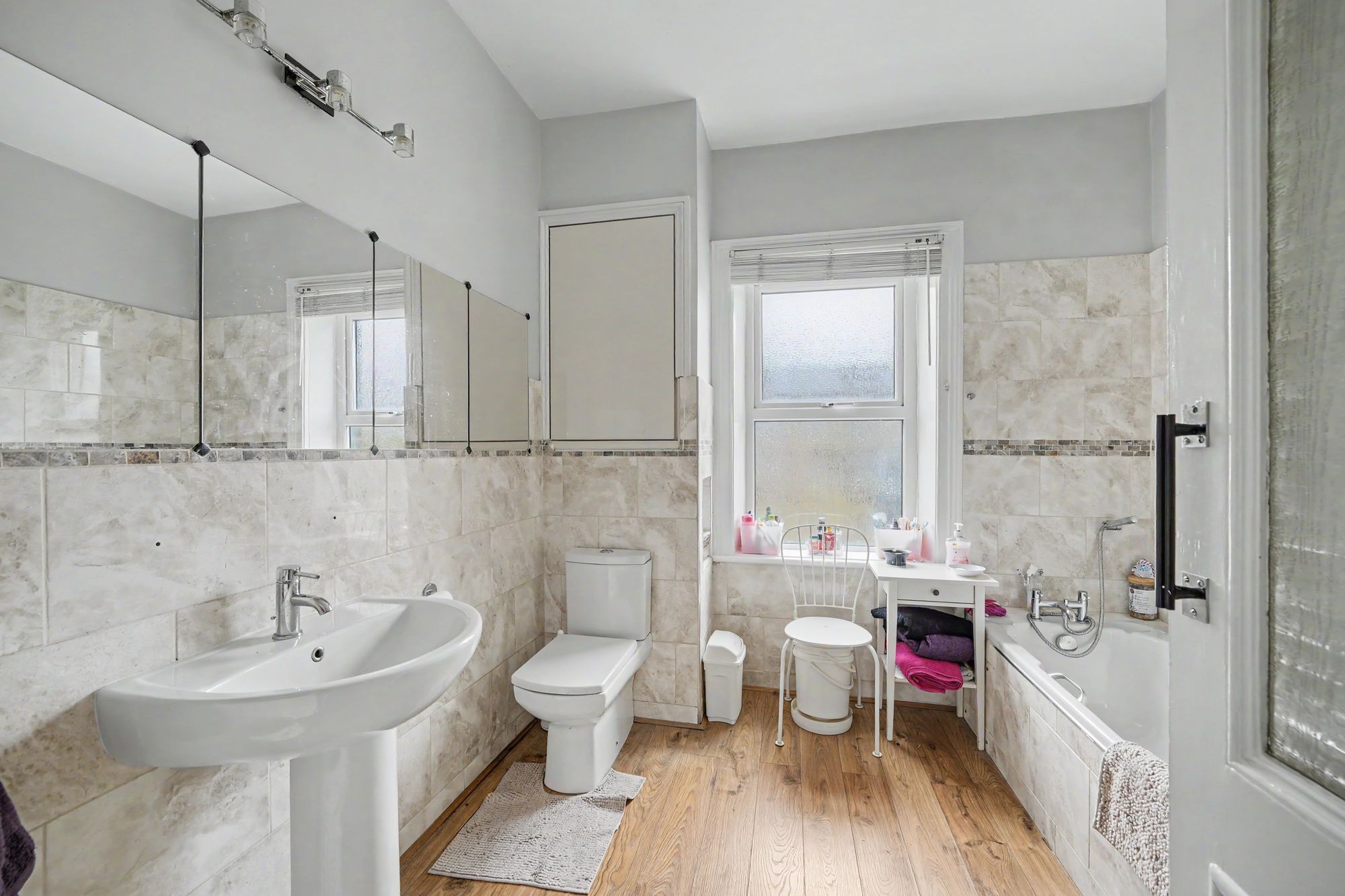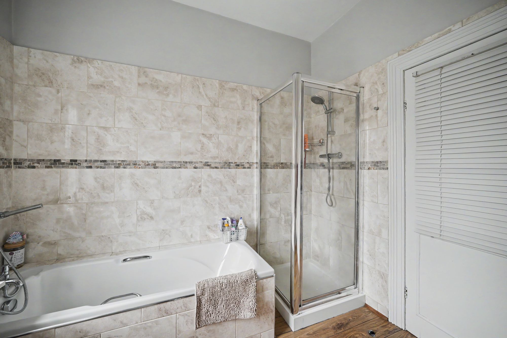 With a frosted uPVC double glazed window, ceiling light point, cupboard housing the gas fired central heating boiler, part tiled walls, central heating radiator, laminate flooring and fitted with a four-piece suite comprising pedestal wash basin with chrome monobloc tap, low flush w.c, bath with tiled side panel and shower cubicle with chrome shower fitting.