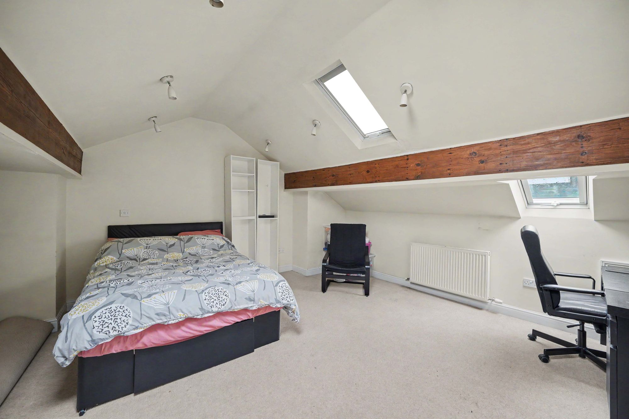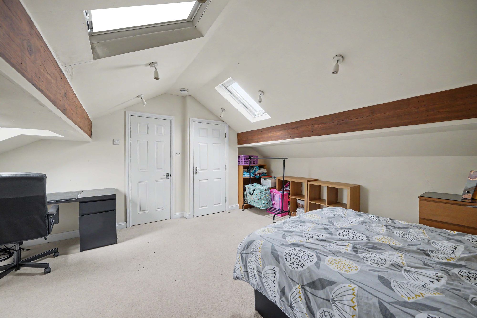 With three Velux double glazed windows, central heating radiator, eight ceiling light points and to one side a door gives access to a walk-in wardrobe.