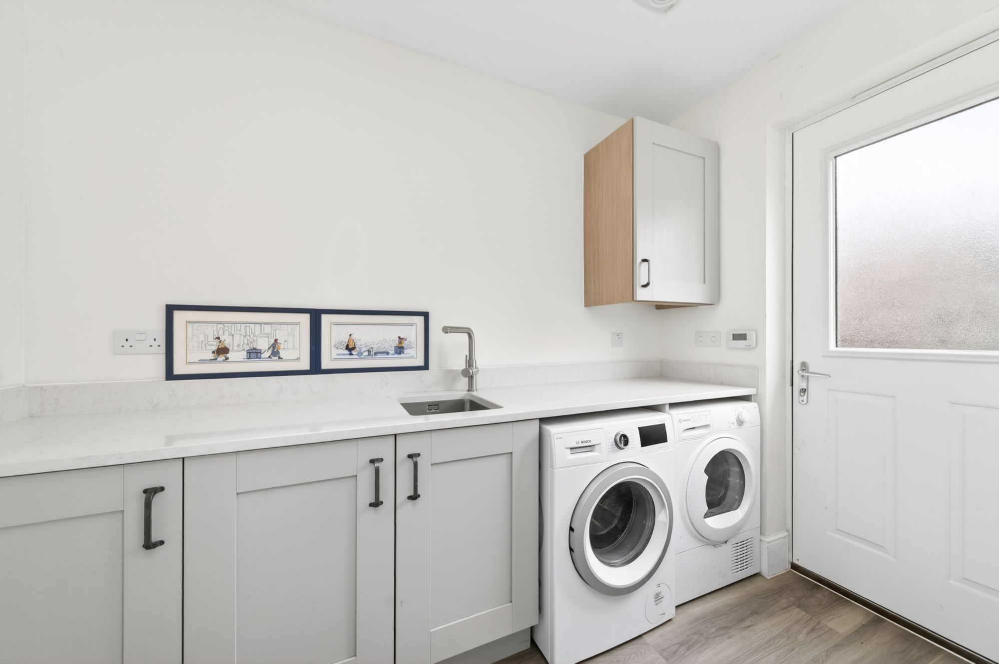 The high-quality flooring continues through from the open-plan dining kitchen into the utility room, which features fitted wall and base units, again with high-quality shaker-style cupboard fronts and complementary quartz work surfaces over, which incorporate an inset stainless-steel sink unit with a brushed chrome mixer tap. The utility room features plumbing and provisions for an automatic washing machine and space for a tumble dryer, a matching quartz upstand to the work surface, inset spotlighting to the ceilings, an extractor fan, and a double-glazed composite door with obscure glazed inserts to the rear elevation.