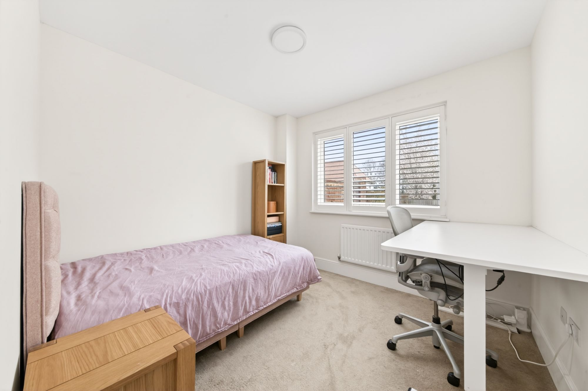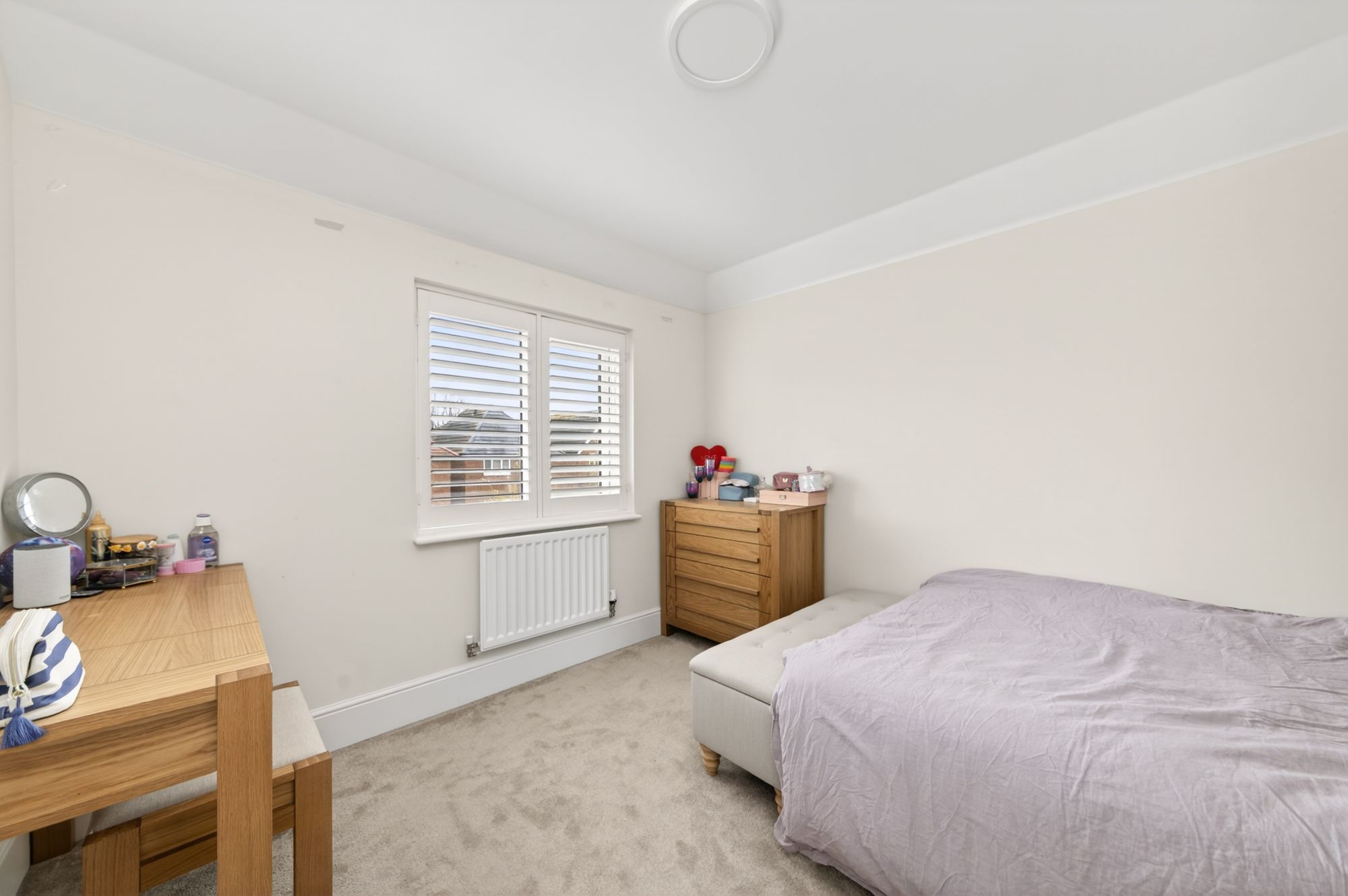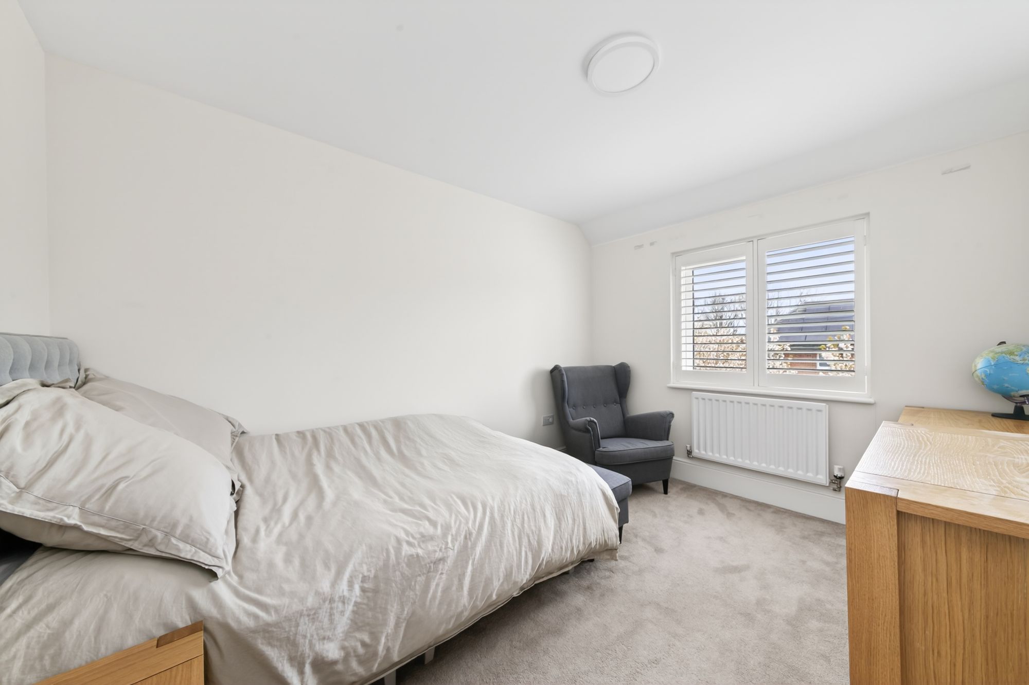 Bedroom three is situated at the rear of the property and can accommodate a double bed with ample space for freestanding furniture. There is a bank of double-glazed windows to the rear elevation with pleasant views onto the gardens and plantation shutters, a ceiling light point, and a radiator.