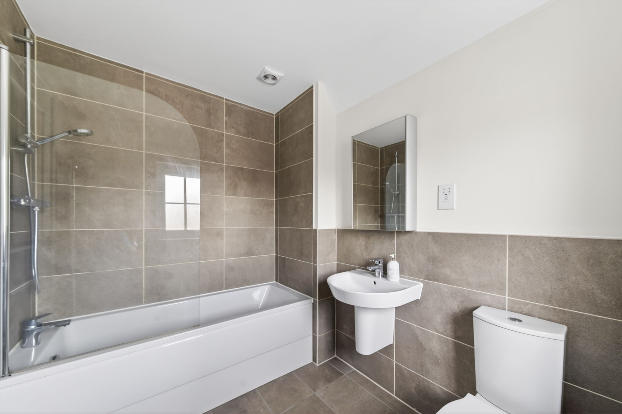 The house bathroom features a modern contemporary three-piece suite which comprises a panel bath with a thermostatic shower over and a glazed shower guard, a broad wall-hung wash hand basin with a chrome monobloc mixer tap, and a low-level WC with a push-button flush. There is tiled flooring and tiling to dado height and the splash areas, a ceiling light point, an extractor fan, a chrome ladder-style radiator, and a double-glazed window with obscure glass and a tiled sill to the front elevation.