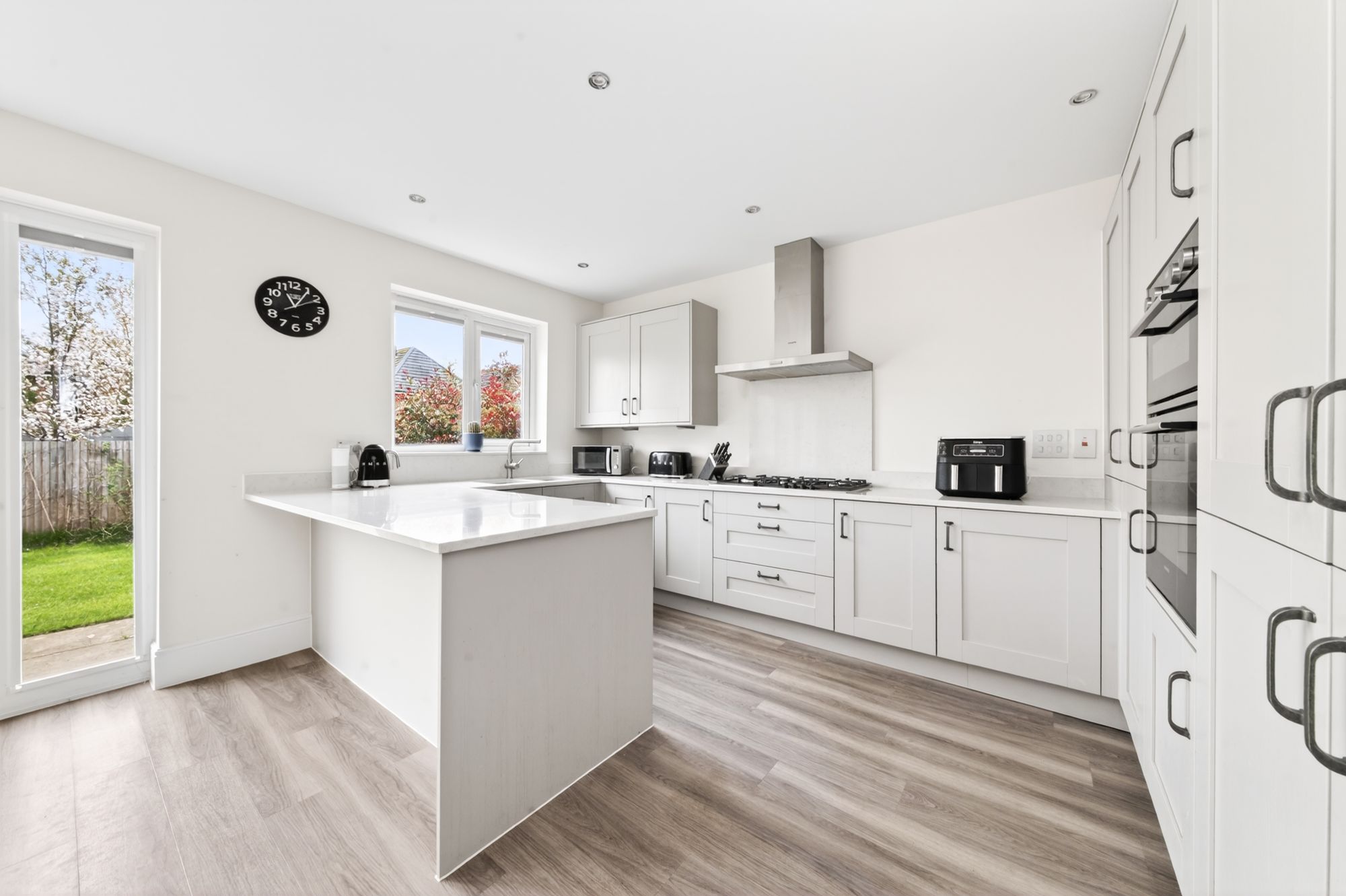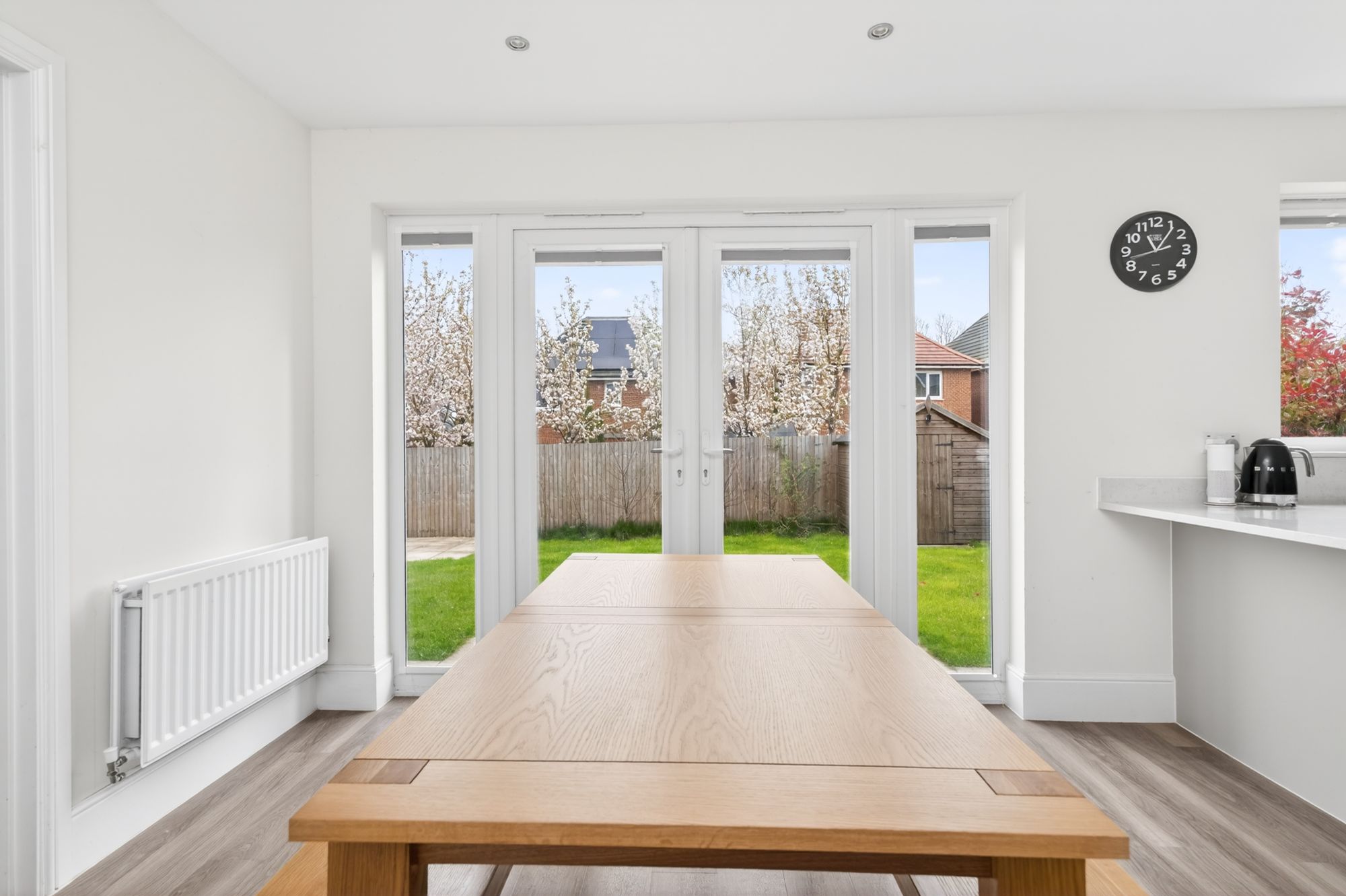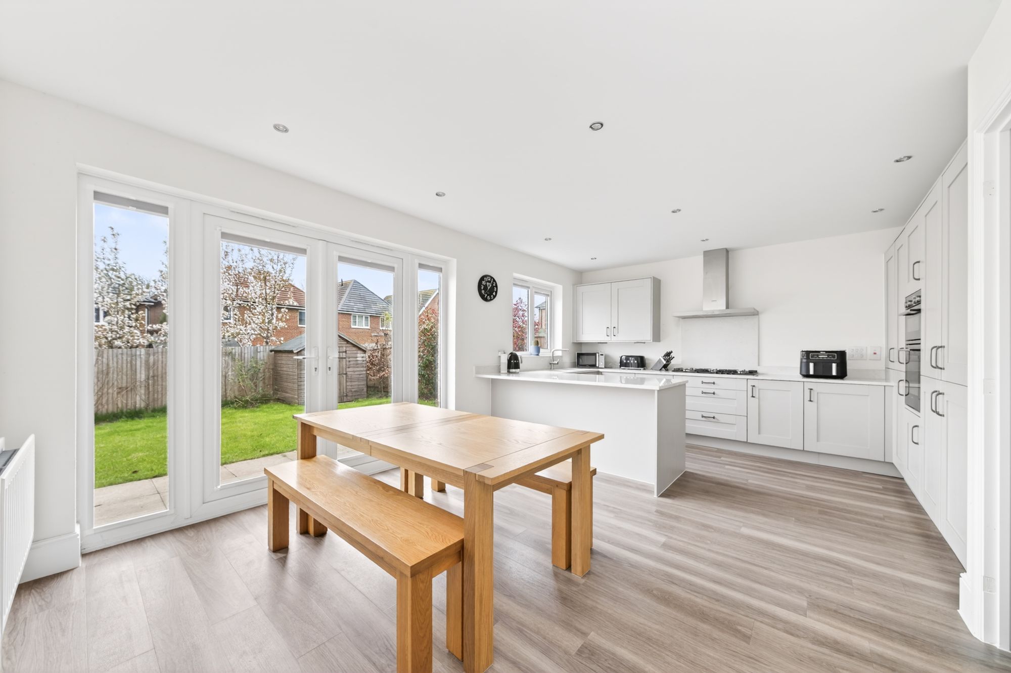 Th dining kitchen enjoys a wealth of natural light cascading through a bank of double-glazed windows to the rear and double-glazed French doors with adjoining windows and integrated blinds, giving direct access to the gardens. The kitchen features a wide range of fitted wall and base units with shaker-style cupboard fronts and complementary quartz work surfaces over, which incorporate a twin stainless-steel inset sink unit with brushed chrome mixer tap. There are also high-quality, built-in Siemens appliances, including a five-ring gas hob with quartz backsplash and Siemens cooker hood over, a waist-level double oven, two fridge and freezer units, and an integrated dishwasher. There is high-quality flooring, inset spotlighting, matching quartz upstand to the work surface, under-unit lighting, pull-out larder cupboards, soft-closing doors and drawers, and access to a useful understairs store cupboard and the utility room.