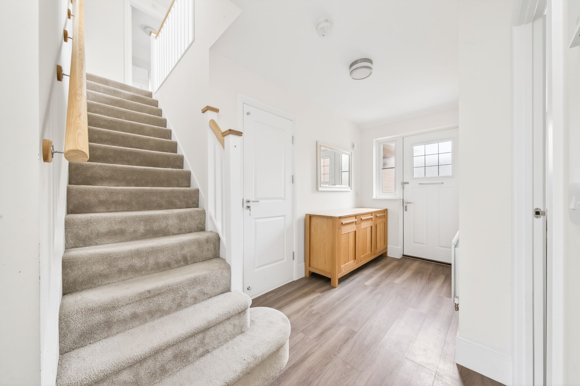 The high-quality flooring continues through from the entrance hall into the downstairs WC, which features a modern and contemporary two-piece suite, comprising a low-level WC with push-button flush and a wall-hung wash hand basin with a chrome monobloc mixer tap and tiled splashback. There is a double-glazed window with obscure glass to the side elevation with a plantation shutter, a radiator, and a ceiling light point.