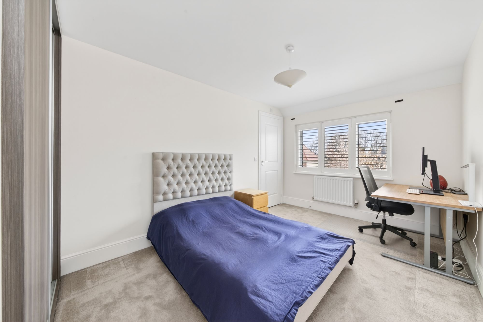 Bedroom two again is a light and airy double bedroom which has ample space for freestanding furniture. There is a bank of double-glazed windows to the rear elevation with pleasant views onto the property’s gardens with plantation shutters, a central ceiling light point, a radiator, and a bank of floor-to-ceiling fitted wardrobes with sliding doors which again have hanging rails and shelving in situ.