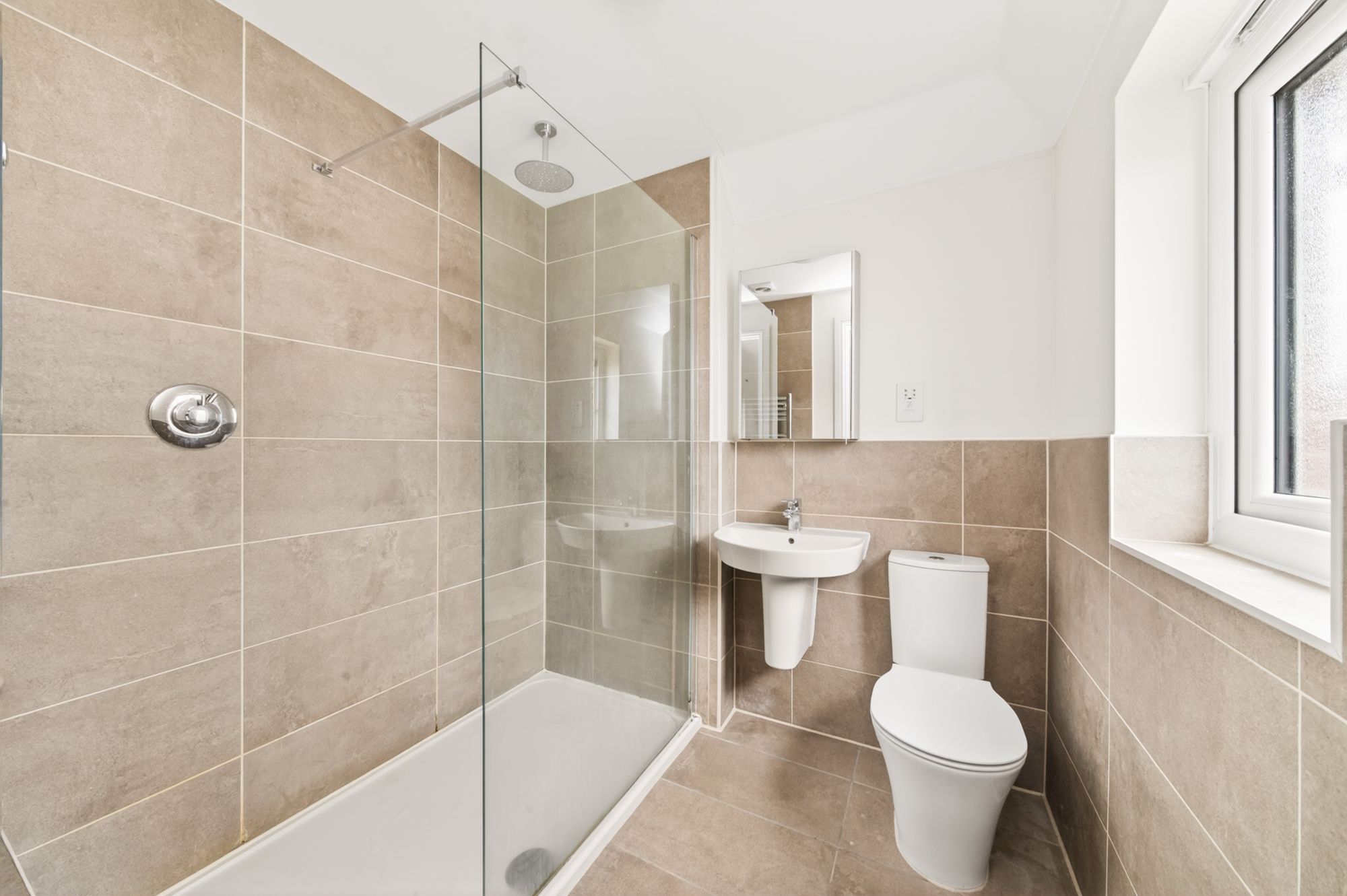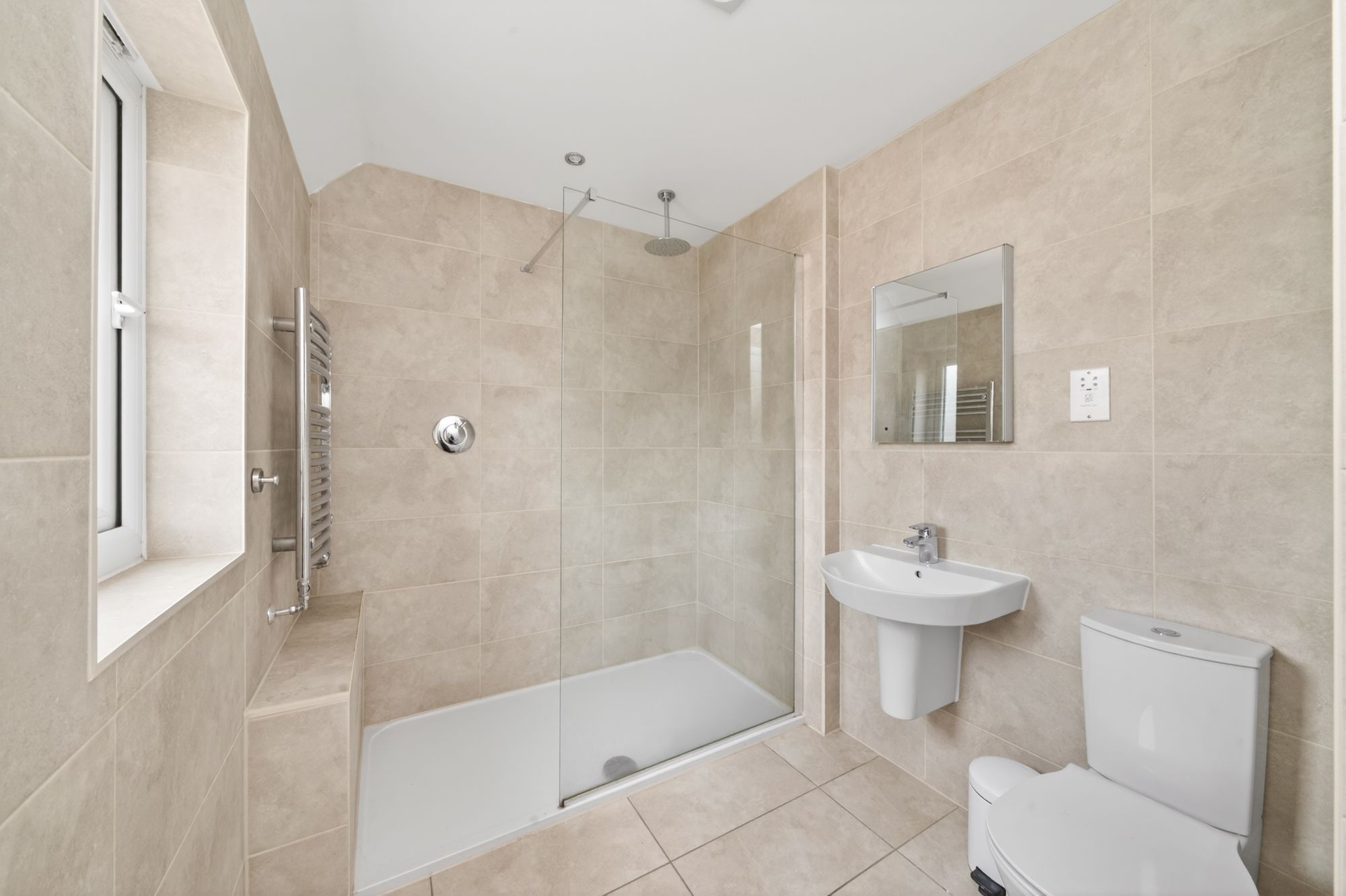 The en-suite shower room features a modern contemporary three-piece suite which comprises a low-level WC with a push-button flush, a broad wall-hung wash hand basin with a chrome monobloc mixer tap, and a fixed-frame walk-in shower with a fixed glazed shower guard and thermostatic rainfall shower head. There are tiled walls and tiled flooring, a chrome ladder-style radiator, a central ceiling light point, and an extractor fan. Additionally, there is a double-glazed window with obscure glass and a tiled sill to the rear elevation, and a shaver point.