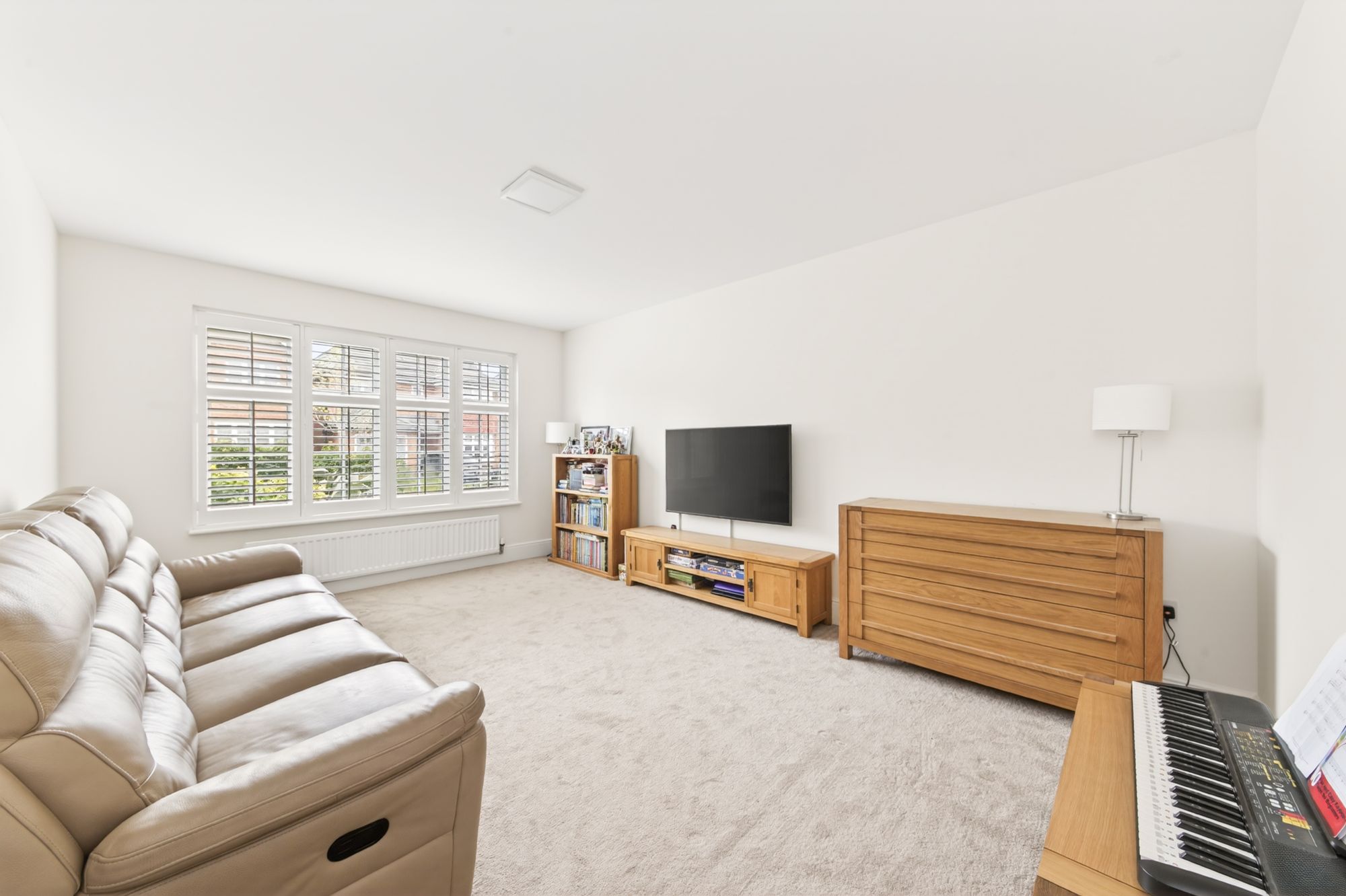 This versatile room can be utilised for a variety of uses, such as a home office, occasional bedroom, or perhaps a playroom. It features a bank of double-glazed windows to the rear elevation with pleasant views onto the property’s gardens and plantation shutters. There is a ceiling light point and a radiator.