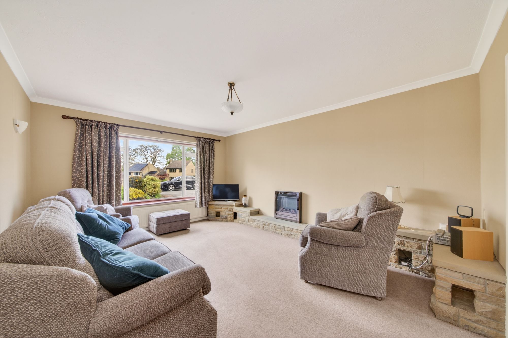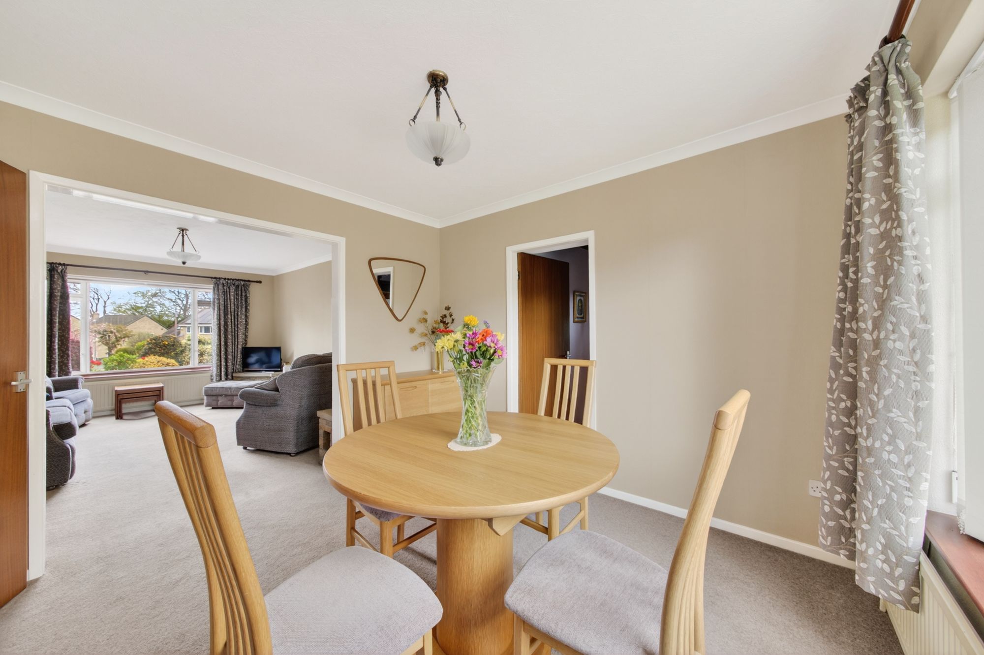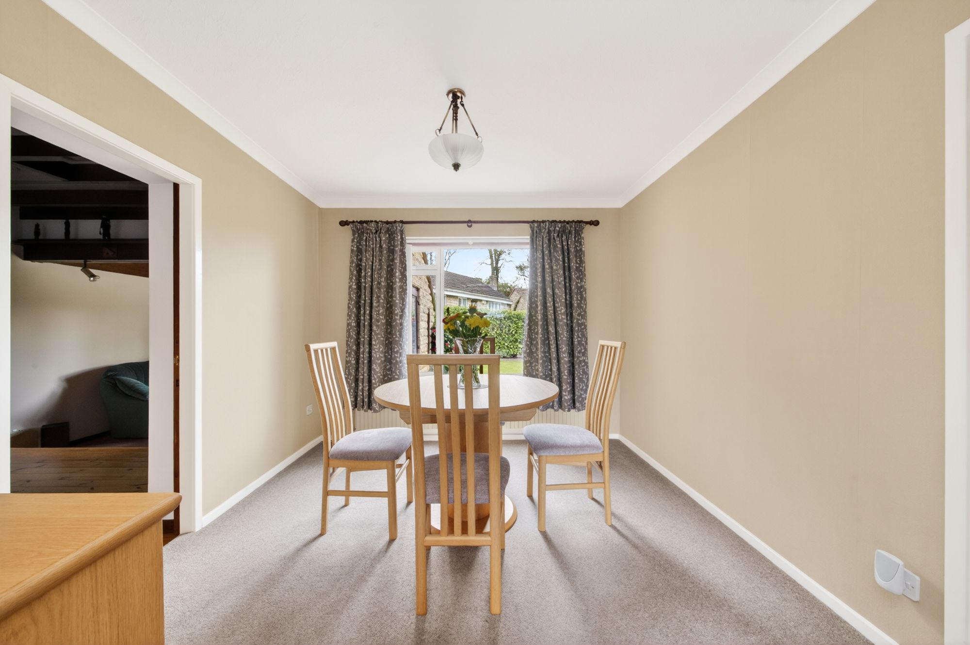 OPEN-PLAN LIVING DINING ROOMThe living dining room enjoys dual-aspect windows to the front and rear elevations, providing a great deal of natural light. The living area (16'0" x 12'4") features decorative coving to the ceiling, two wall light points, a central ceiling light point, a radiator, and the focal point of the room is the remote-controlled, electric fireplace with decorative stone hearth. A double doorway then leads seamlessly into the formal dining room (10'9" x 10'3") which has decorative coving to the ceiling, a central ceiling light point, a radiator and pleasant views across the gardens. From here, doors lead into the kitchen and the garden room / sitting room.