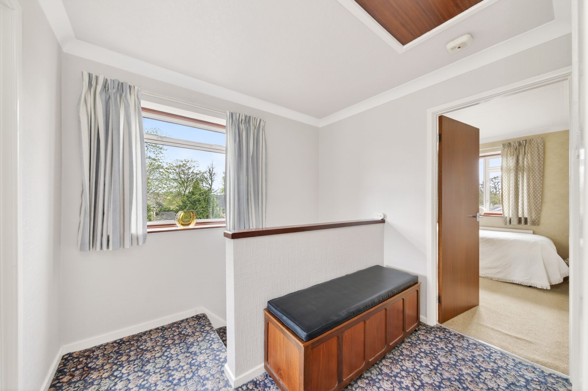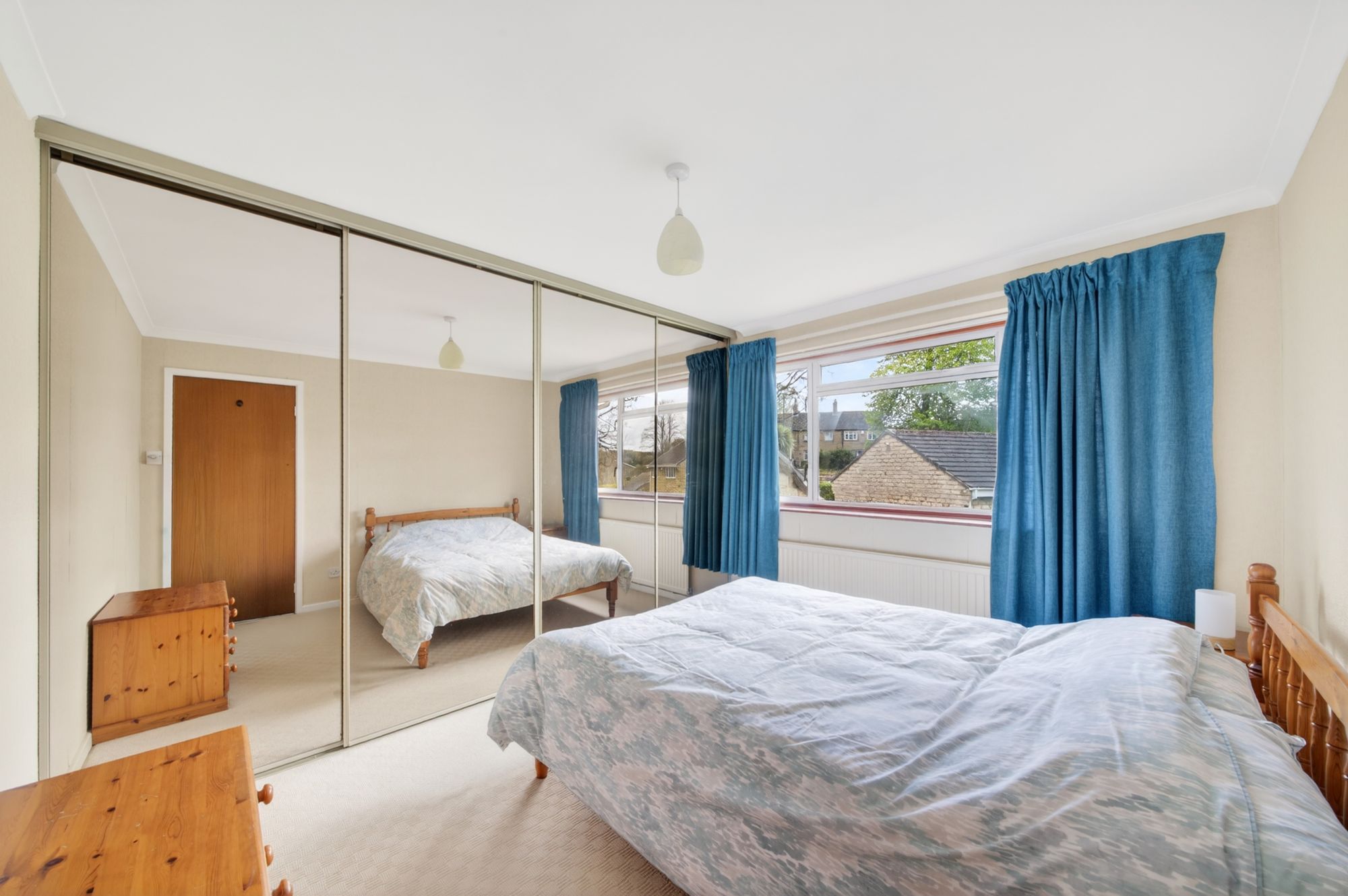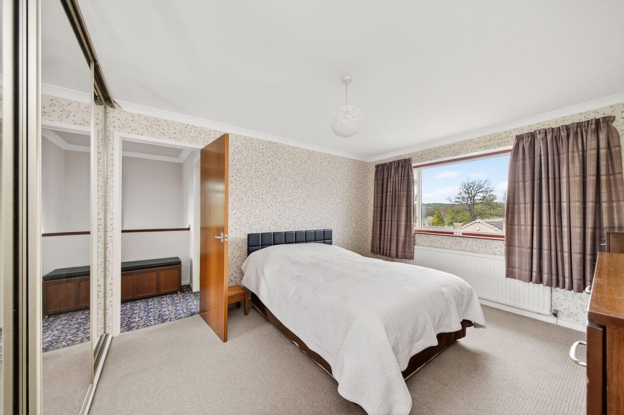 Bedroom one is a generously proportioned, light and airy double bedroom with ample space for freestanding furniture. There is decorative coving to the ceiling, a central ceiling light point, a radiator, and a bank of double-glazed windows to the front elevation which offer fantastic, open-aspect views across the valley and of the tree-lined backdrop. The principal bedroom also benefits from floor-to-ceiling fitted wardrobes with hanging rails, shelving and sliding mirrored doors in situ. An interconnecting door provides access to bedroom four / study which is also directly accessed by the spiral staircase from the garden room / sitting room.