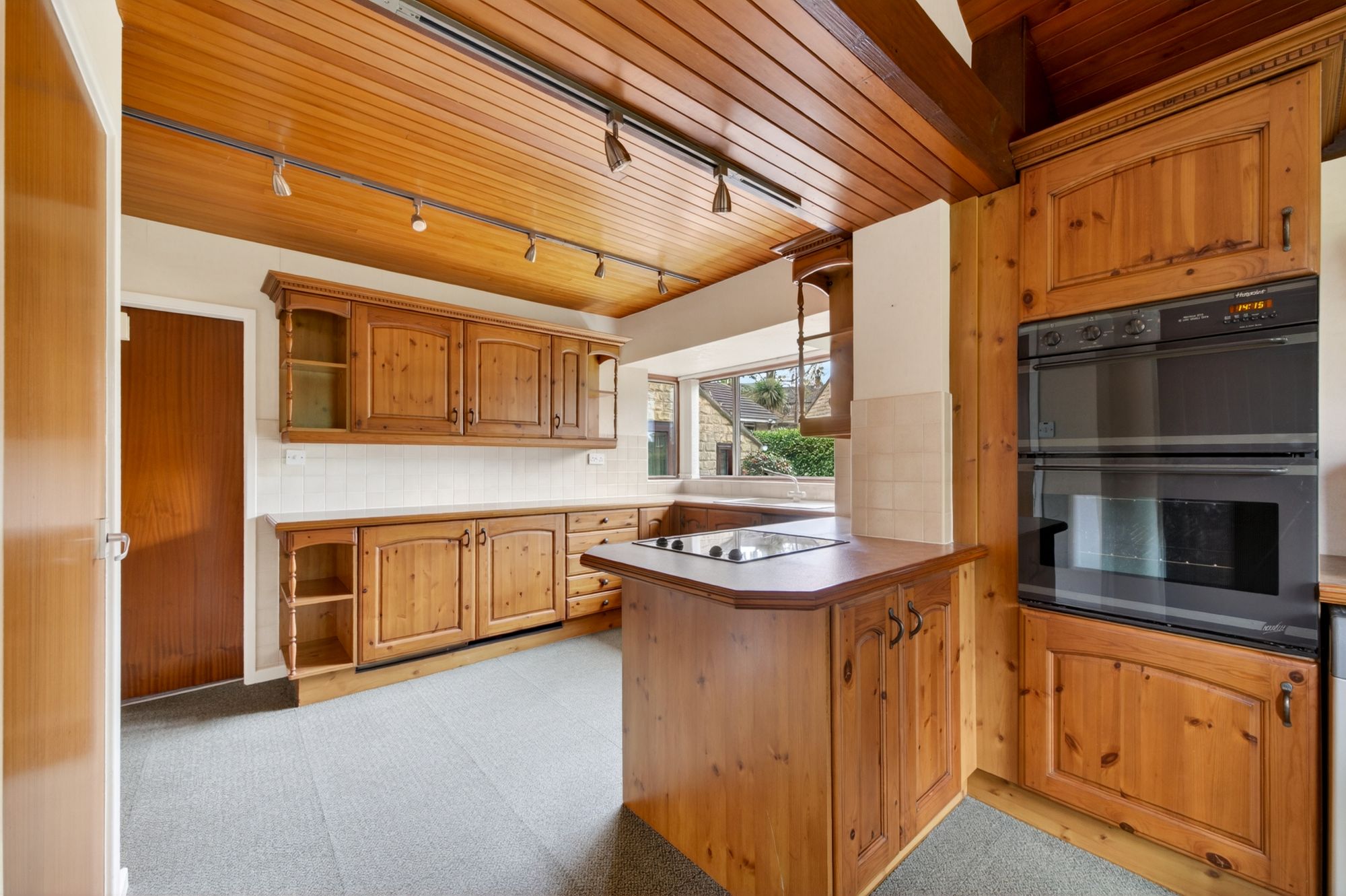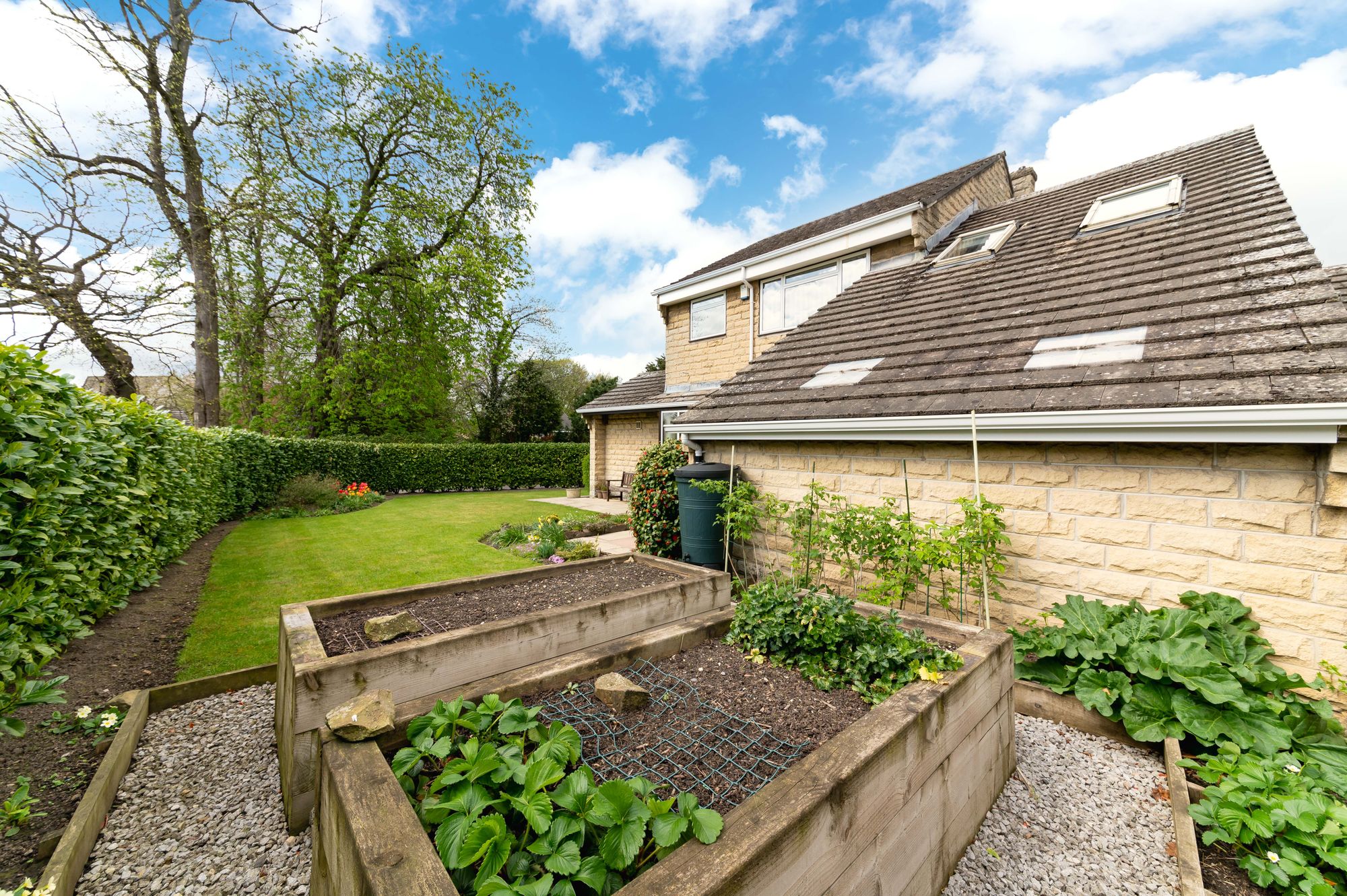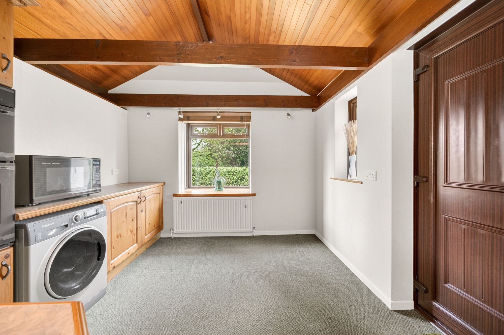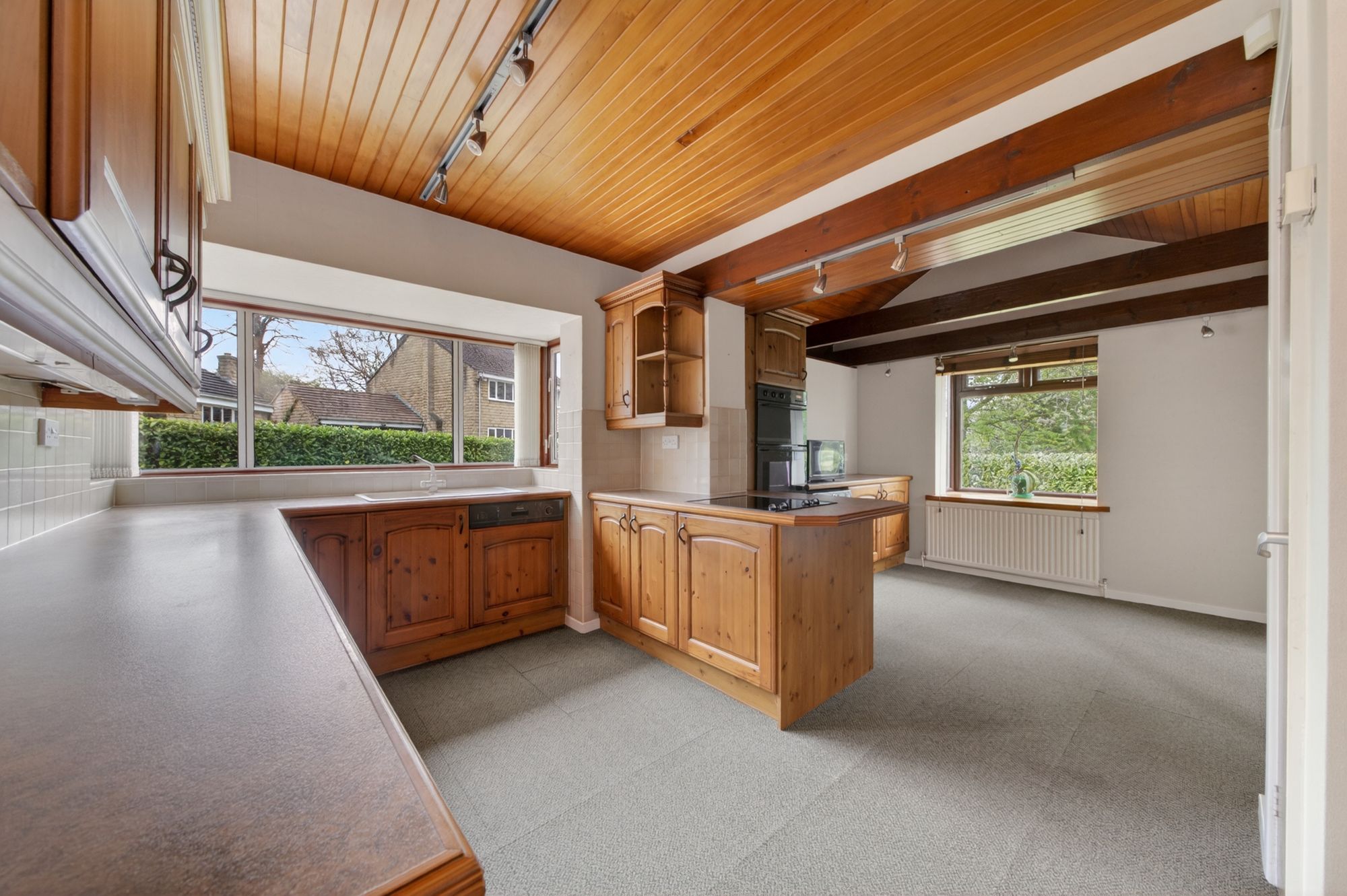 The breakfast kitchen features a wide range of fitted wall and base units with shaker-style cupboard fronts and complementary work surfaces over, which incorporate a single-bowl, composite sink and drainer unit with mixer tap over. Built-in appliances include a four-ring ceramic hob, a waist-level double oven, a dishwasher, and under-counter fridge and freezer units. There is tiling to splash areas, under-unit lighting, display shelving, triple-aspect windows including bayed windows to the rear and side elevations. The kitchen is separated into two areas, with the breakfast area featuring ceiling light points, a fabulous vaulted ceiling with exposed timber beams on display, and an external door. Additionally, there is a useful pantry cupboard, attractive wood-panelled ceilings, an extractor vent, and two radiators.
