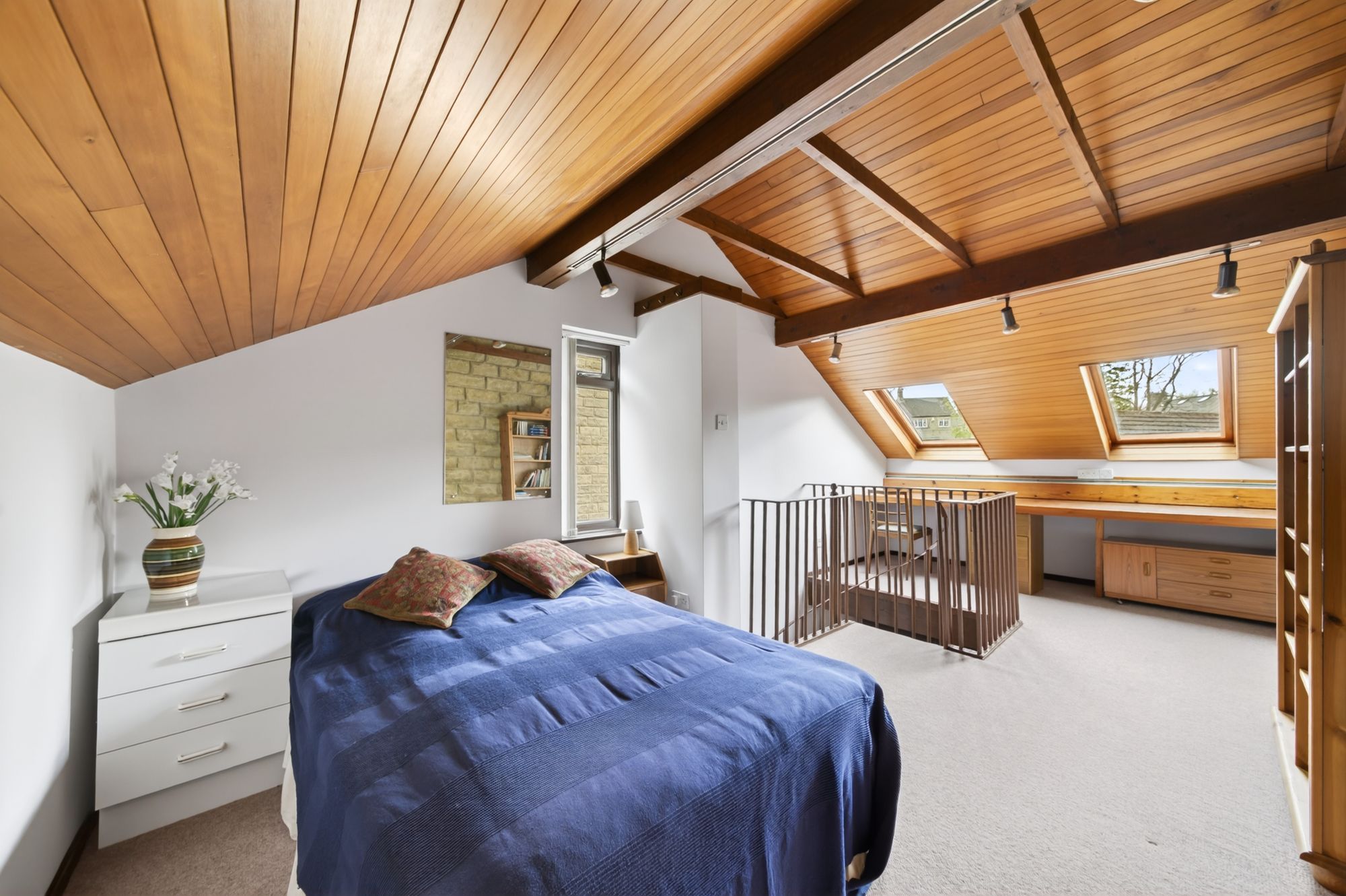 Bedroom four has direct access from the garden room / sitting room via the cast-iron spiral staircase. It enjoys a wealth of natural light courtesy of two double-glazed skylight windows with integrated blinds and a double-glazed window to the side elevation, and an impressive vaulted ceiling with wood panelling and exposed timber beams on display. This bedroom can accommodate a double bed with ample space for freestanding furniture and features two radiators, various ceiling light points, a useful under-eaves storage area, and a fantastic fitted work surface for use as a workshop or office. Here, there is a feature window and skirting heating.