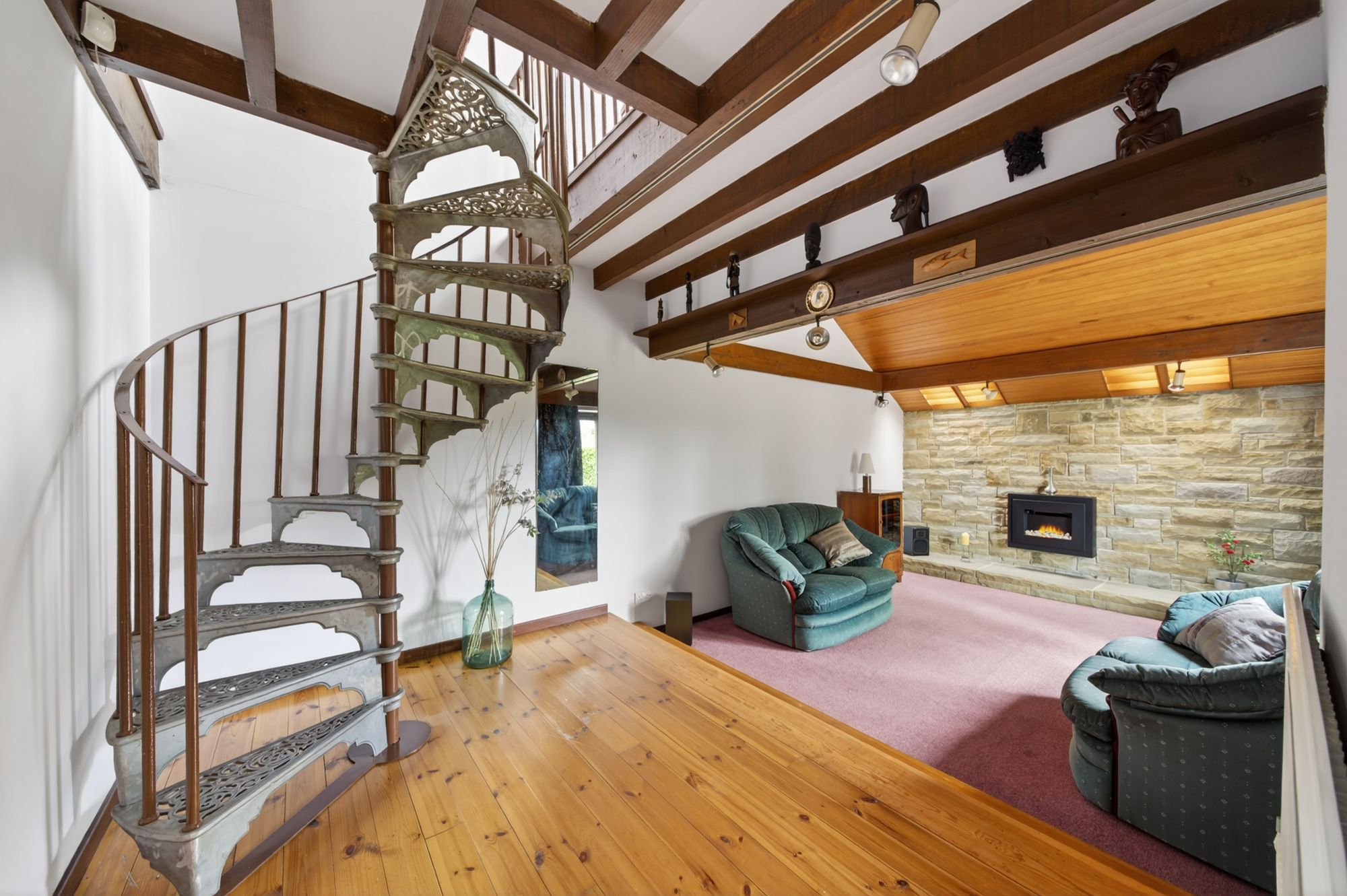 The garden room / sitting room enjoys a wealth of character features, including a fabulous, exposed stone wall, an impressive vaulted ceiling with wood panelling, and exposed timber batons to the ceiling. There is part hardwood flooring and part carpeted flooring, a radiator, various ceiling light points, feature skylight windows, double-glazed windows to the side elevation, a wall-mounted decorative fireplace with stone hearth, and double-glazed French doors to the side elevation which provide access out to the patio. A cast-iron, ornate, spiral staircase then also proceeds to the first floor.