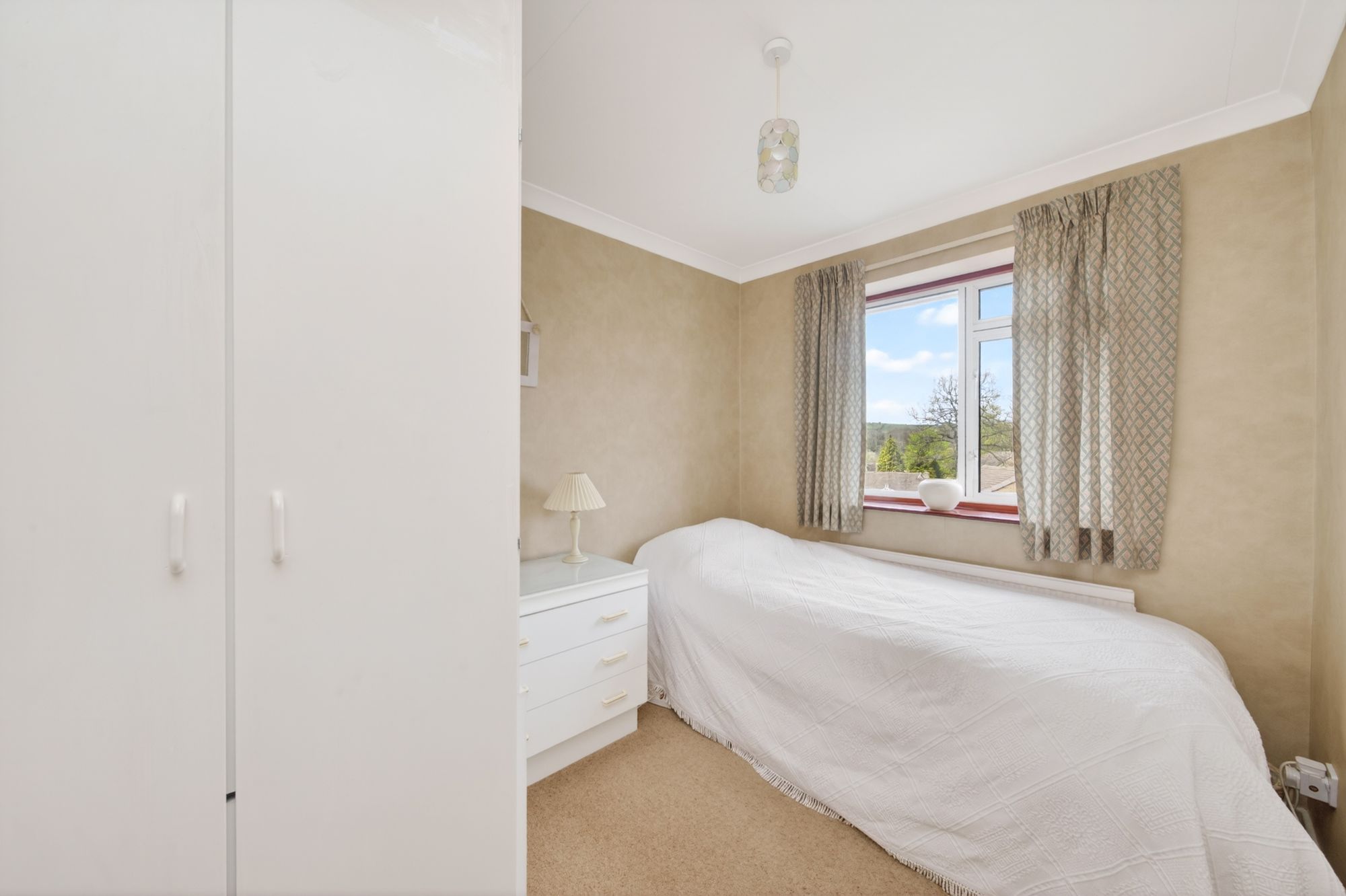 Bedroom three can accommodate a double or three-quarter bed with space for freestanding furniture. It features decorative coving, a ceiling light point, a radiator, a fitted wardrobe with hanging rail and shelving over the bulkhead for the stairs, a bank of double-glazed windows to the front elevation, taking full advantage of the property's position.
