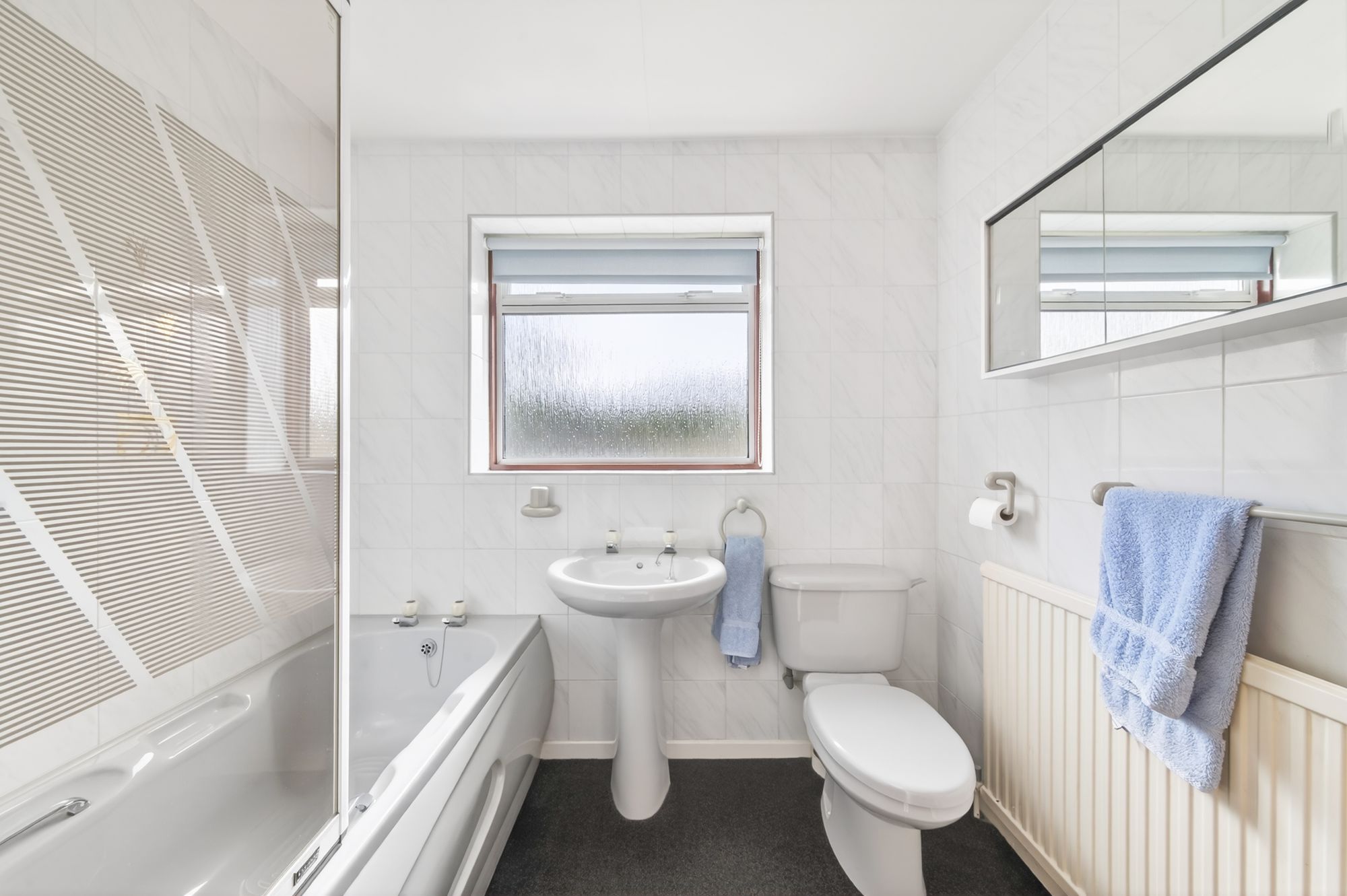 The bathroom features a three-piece suite comprising a panel bath with electric Mira Advance shower over, a pedestal wash hand basin and a low-level WC. There is a double-glazed window with obscure glass and tiled surround to the rear elevation, a radiator, a ceiling light point, and a cupboard housing the hot water cylinder and providing ample storage for toiletries and towels.