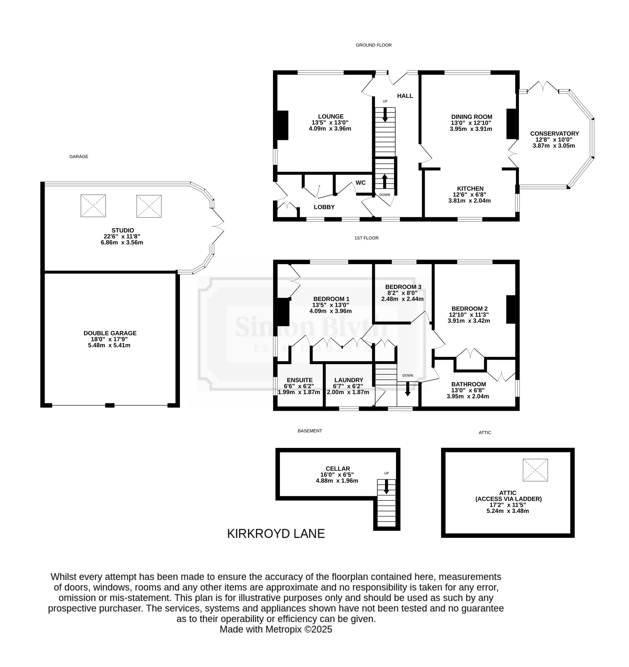 The property accommodation briefly comprises of entrance hall, rear lobby, downstairs w.c., lounge, formal dining room which is open plan to a kitchen and conservatory to the ground floor. To the first floor there is a utility room accessed from the half-landing, three bedrooms and the bathroom with the principal bedroom having ensuite facilities. Externally to the front is a flagged patio and lawn garden, with a driveway accessed off the lane leading to the detached double garage with attached multi-purpose studio/garden office.