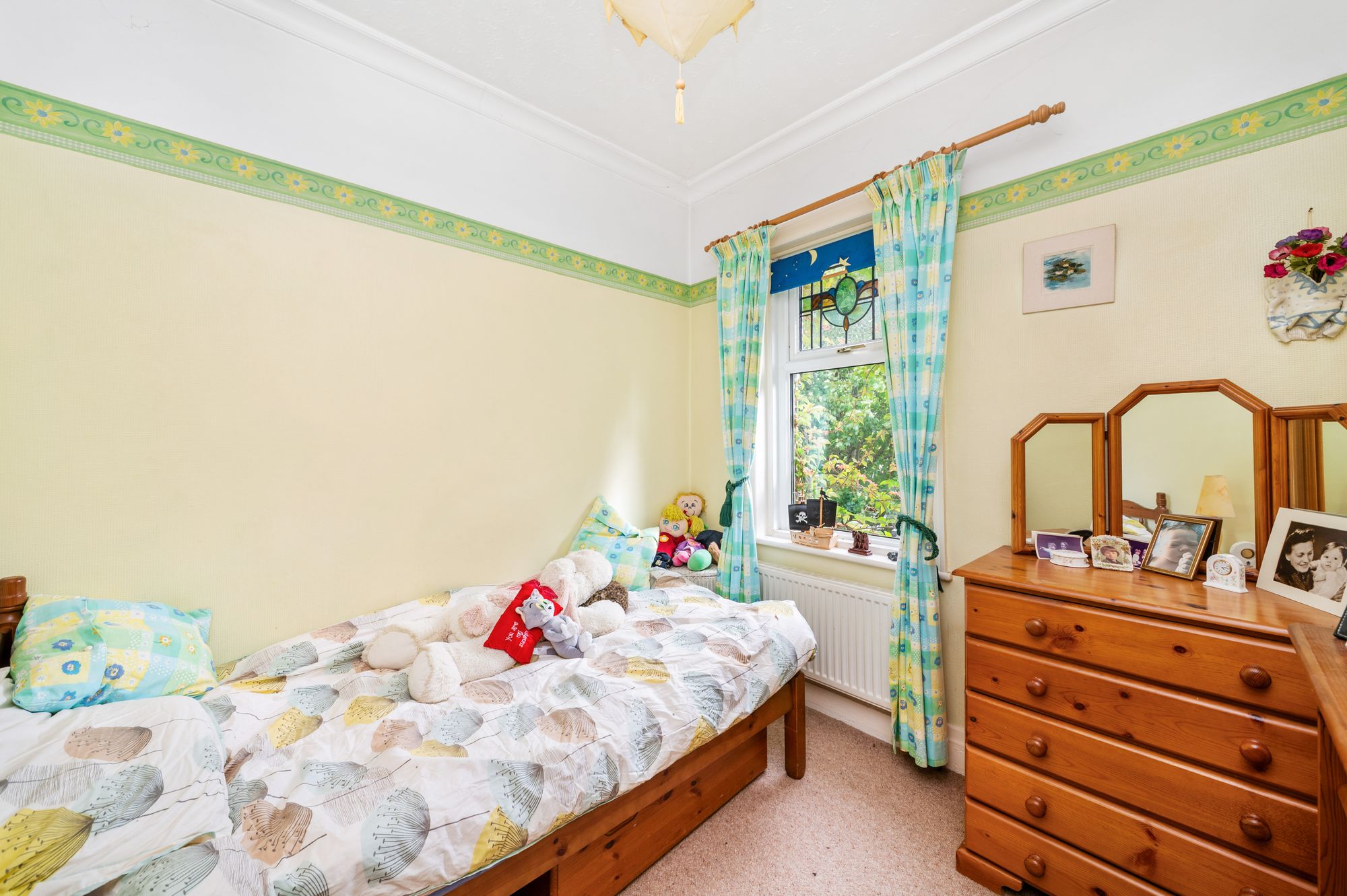 As the photography suggests, bedroom one is a generous proportioned light and airy double bedroom which features dual aspect windows, both with obscure and stained-glass inserts with leaded detailing with a bank of mullioned windows to the front elevation. There is decorative coving to the ceiling, a ceiling light point, radiator and the room benefits from an array of fitted furniture which includes built-in wardrobe with hanging rails, shelving and cupboard with a matching dressing table and with a concealed door which leads to the ensuite shower room.