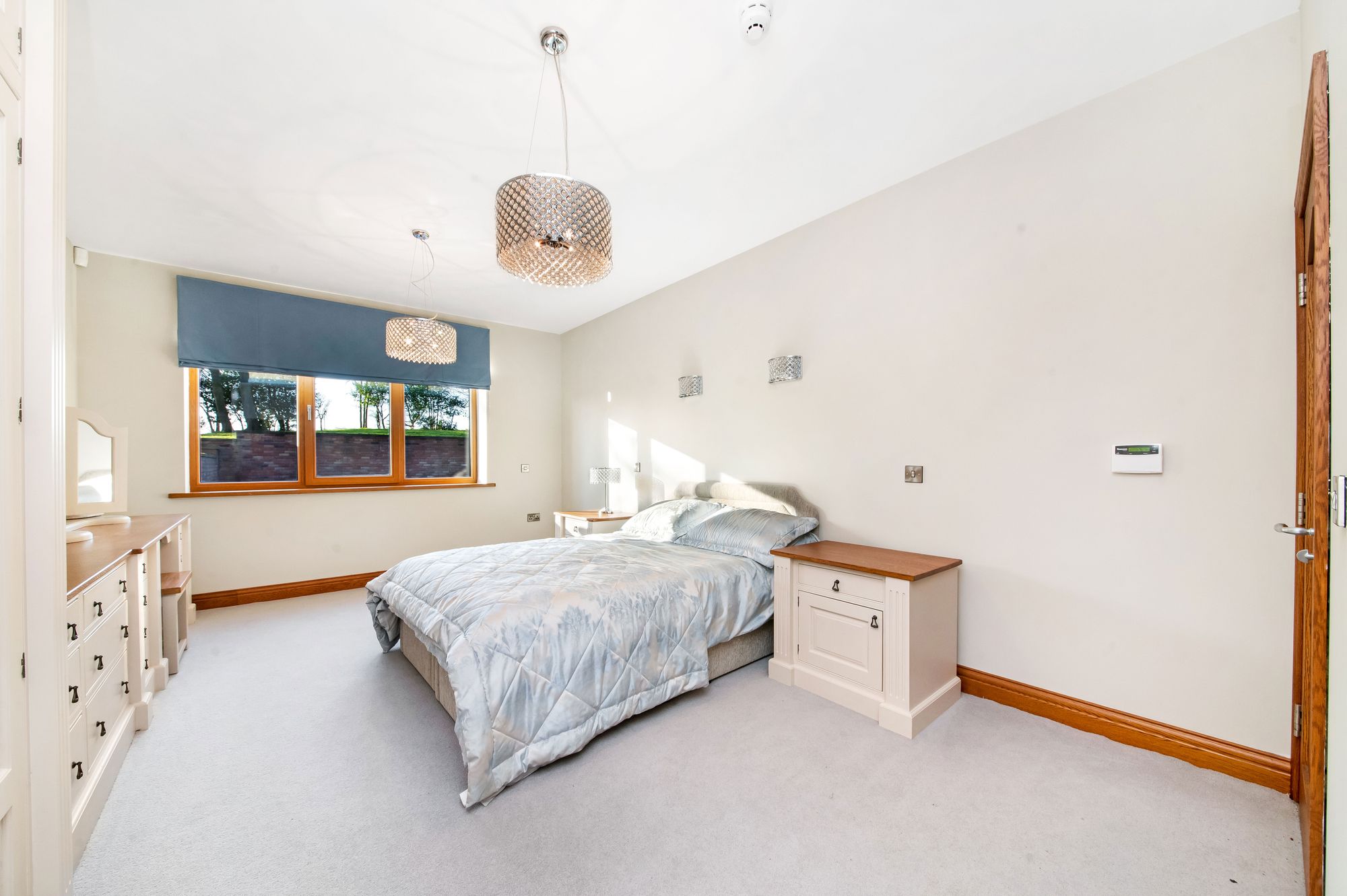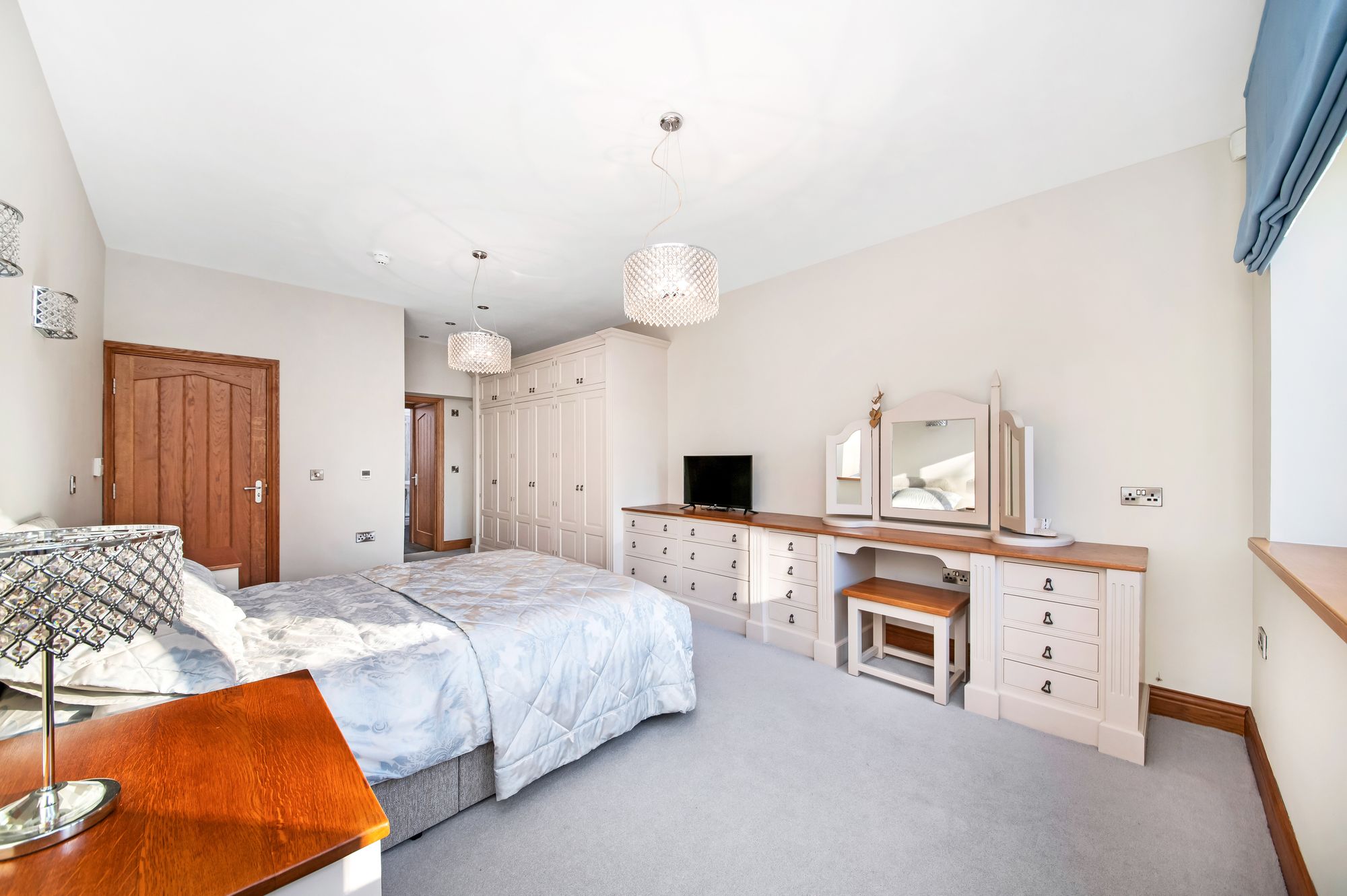 Bedroom one is a fabulously proportioned, light, and airy exceptionally large bedroom which benefits from an array of fitted furniture. There is a bank of triple glazed Alu-Clad windows to the rear elevation with a fabulous outlook onto the property’s gardens and grounds. Two ceiling light points, two wall light points, and an oak door provides access to the en-suite bathroom. The principal bedroom benefits from fitted wardrobes which have hanging rails and shelving in situ with overhead cabinets, two drawer units and a fabulous dressing table with drawers to either side. There are matching free standing bedside tables.