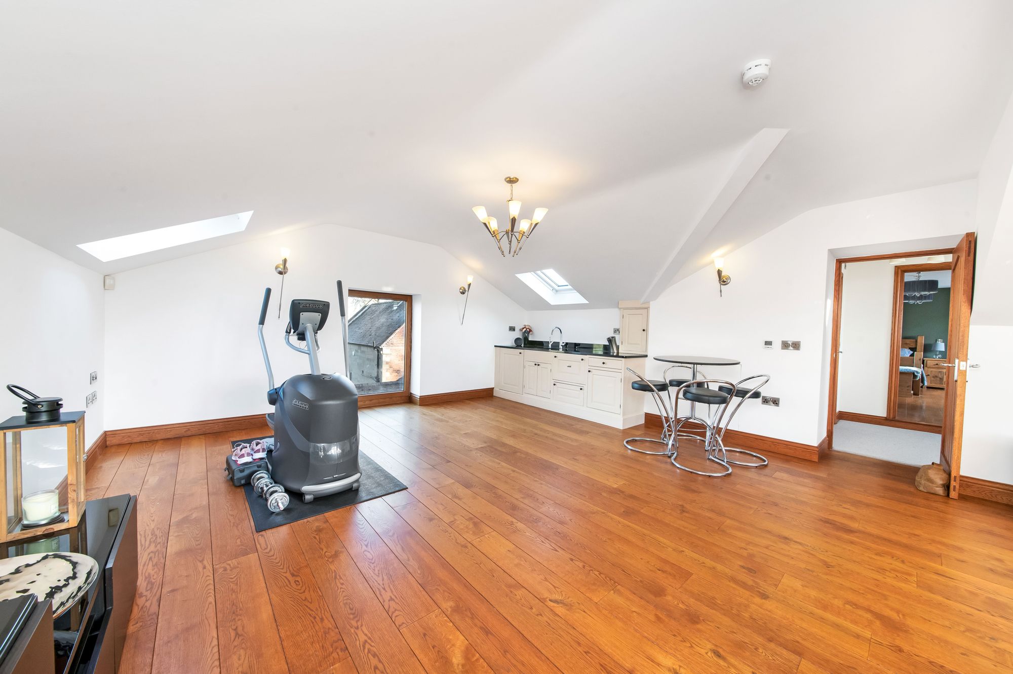 There is oak flooring with underfloor heating, ample plug points and the room benefits from solid wood fitted base units with fixed frame shaker style cupboard fronts and with complimentary granite work surfaces over which incorporate a composite inset Franke sink unit with brushed chrome mixer tap and an additional boiling Quooker tap. There is an integrated under counter fridge unit, soft closing doors and drawers and an integrated Fisher and Paykel dish drawer. This wing of the first floor could be utilised as a self-contained studio with ample space for a bedroom area, living area, kitchen area or even perhaps be utilised as two further bedrooms if so required. The possibilities are endless.