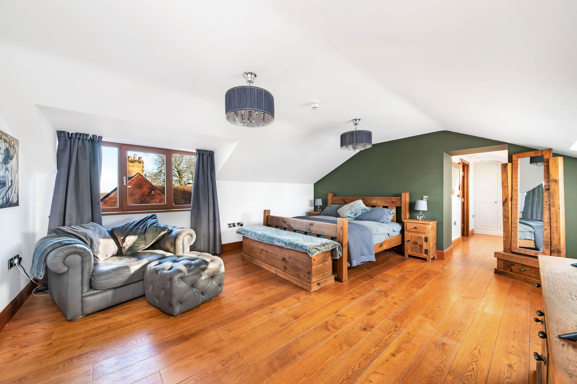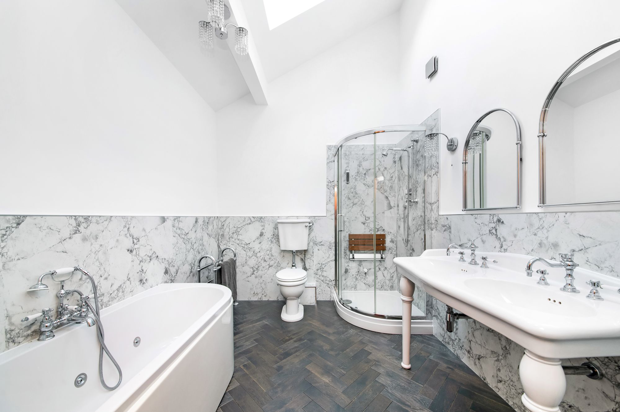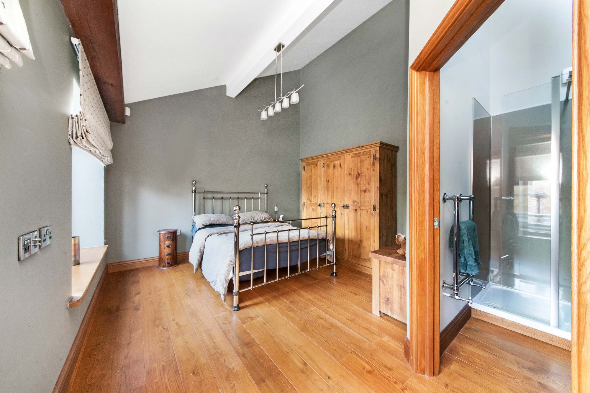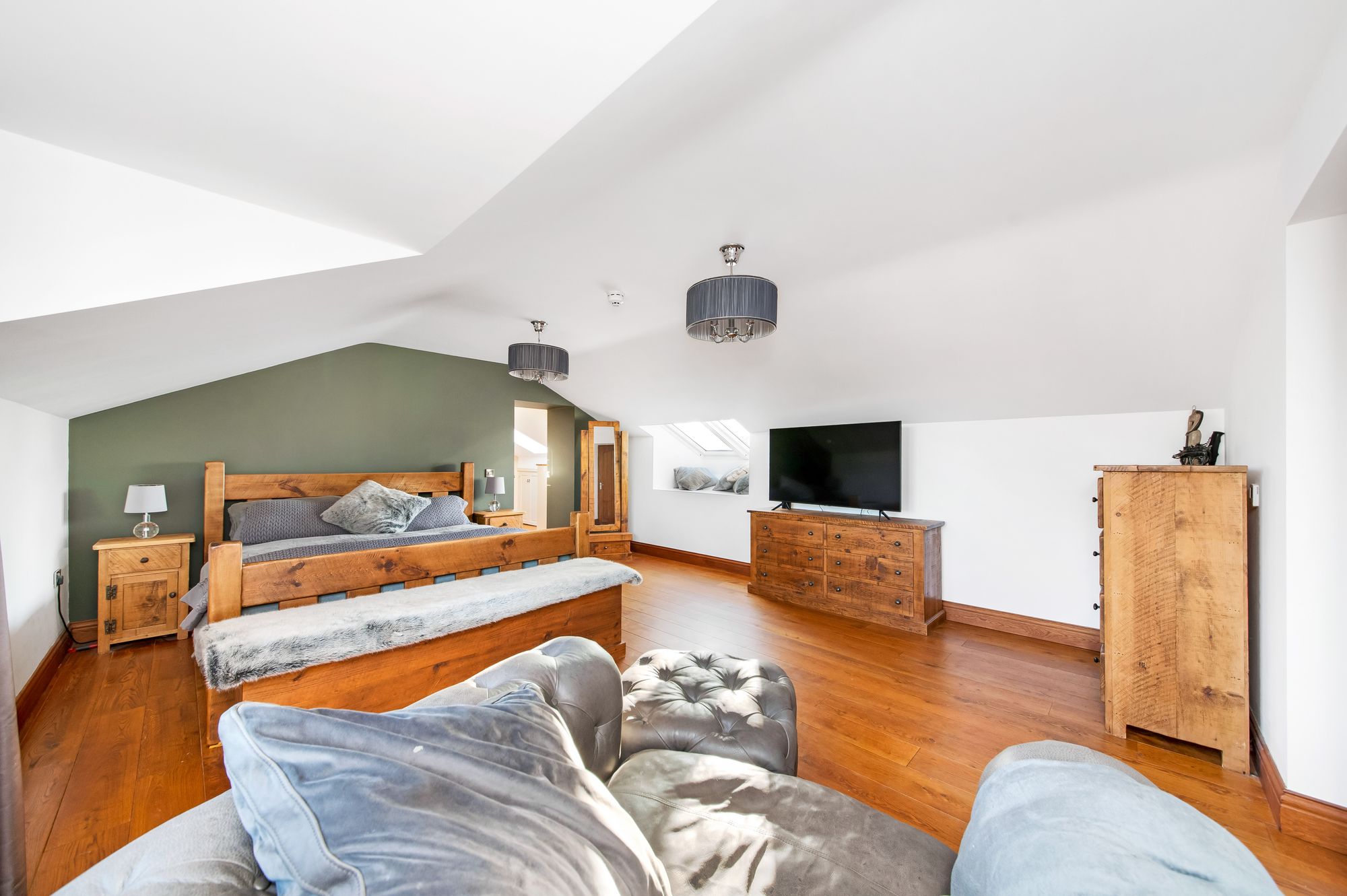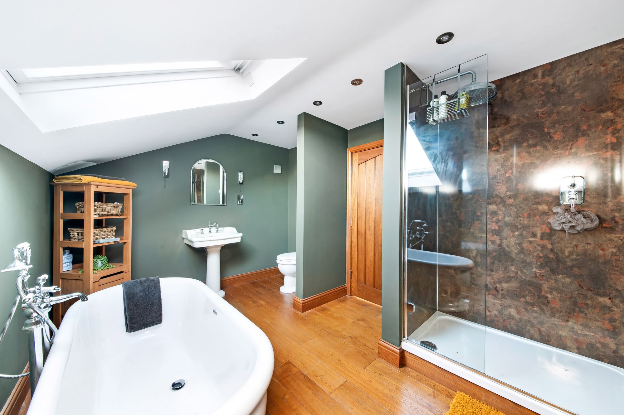 The en-suite bathroom features a fabulous high quality four-piece suite which comprises of a low-level W.C., broad pedestal wash hand basin, free standing double ended bath with floor mounted shower head mixer tap and a step in fixed frame shower cubicle with thermostatic rainfall shower. There is oak flooring, inset spotlighting to the ceiling, two light points, shaver point and an extractor fan. Additionally, there is a double-glazed remote-controlled sky light window with integrated blind to the front elevation and oak flooring with underfloor heating.