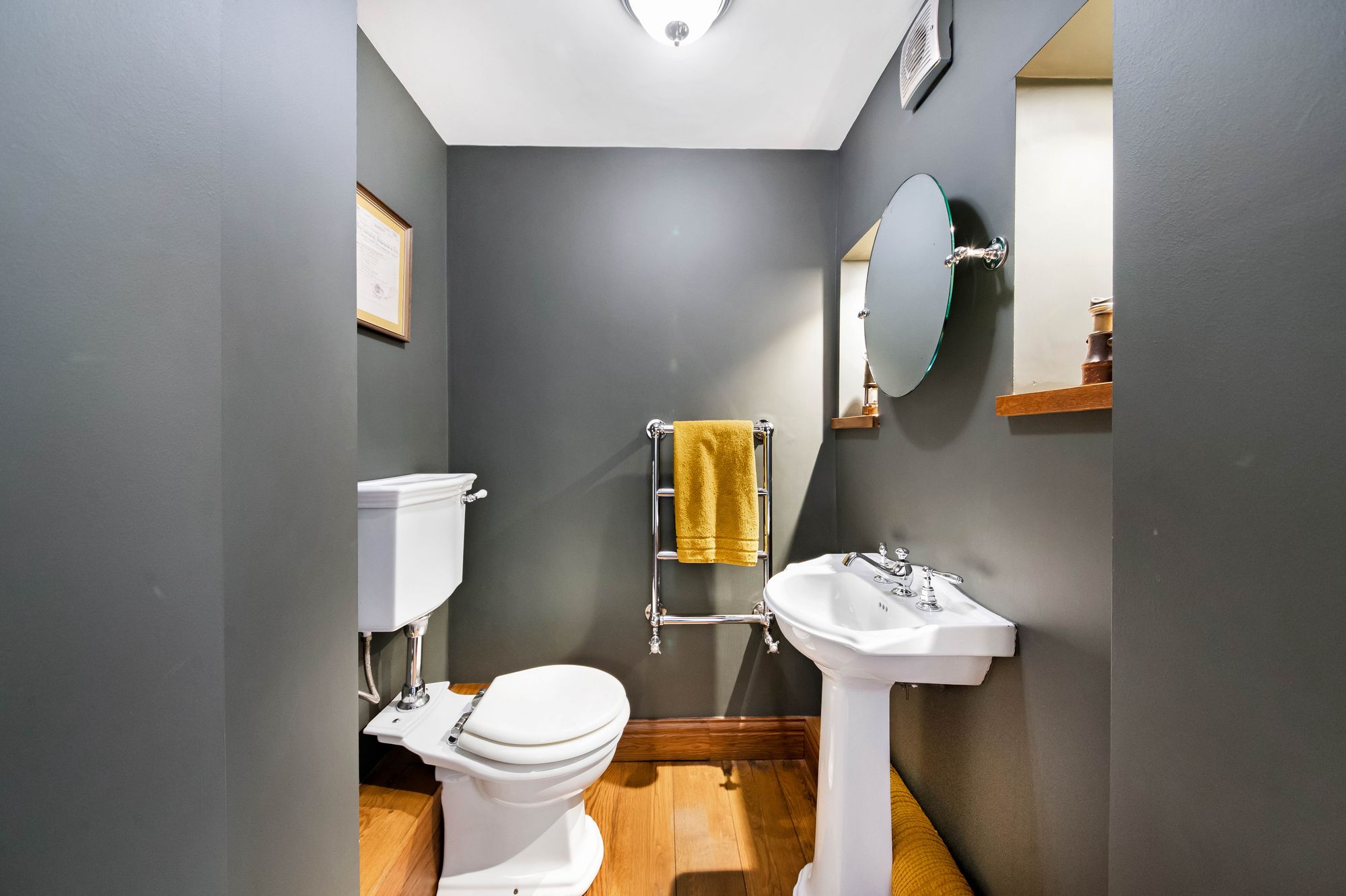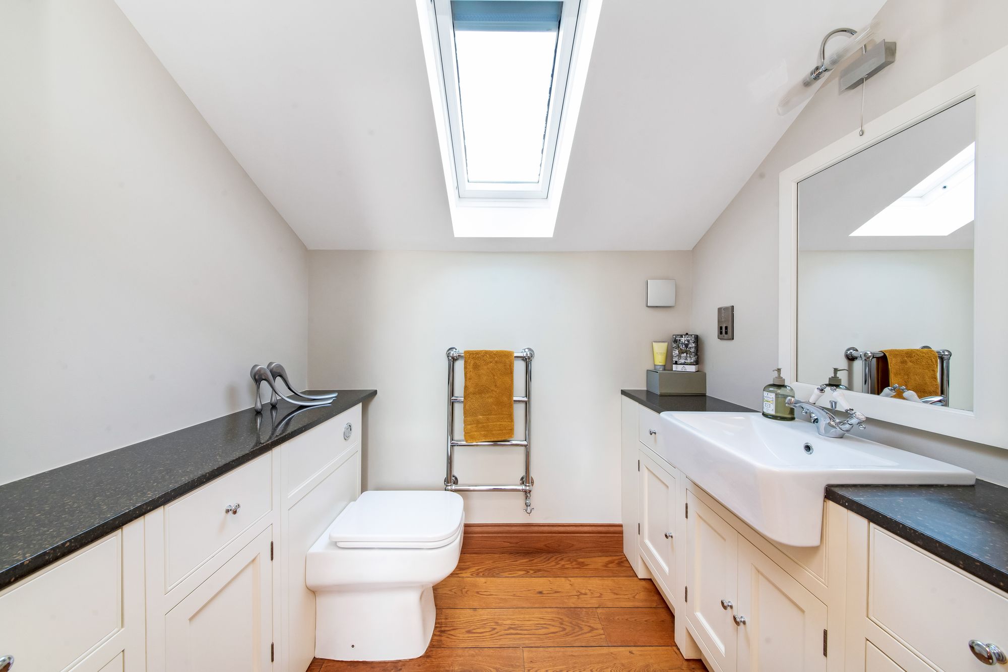 FIRST FLOOR W.C.The first floor W.C. features a modern contemporary two-piece suite which comprises of a low-level W.C. with concealed cistern and push button flush which incorporates useful storage units and a broad wash hand basin with vanity cupboards beneath. There is oak flooring with under floor heating, chrome ladder style radiator, shaver point, light, and extractor fan. Additionally, there are two wall light points and a double-glazed sky light window to the front elevation.