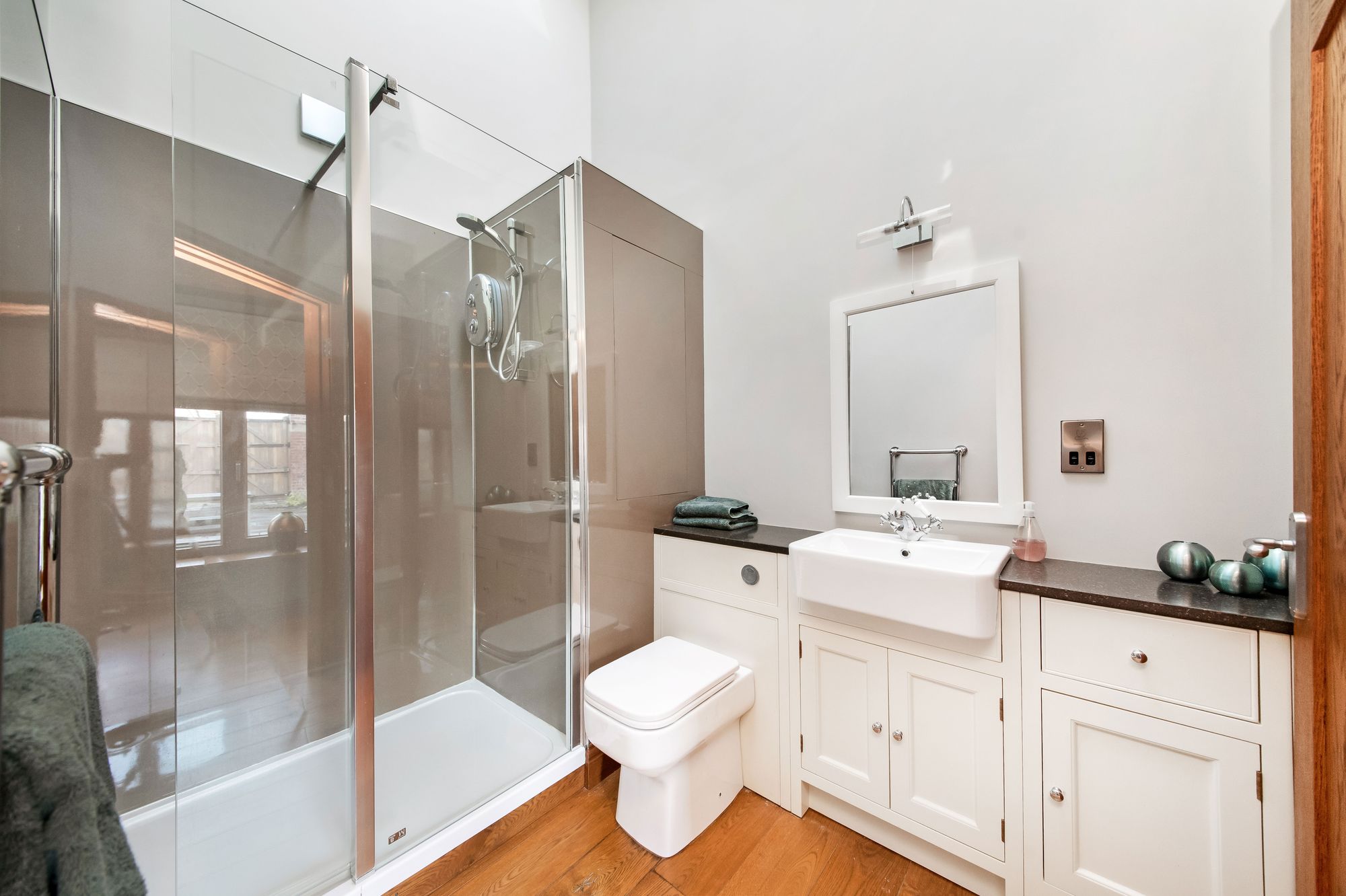 The en-suite shower room features a modern contemporary three-piece suite which comprises of a fixed frame shower cubicle with Mira electric shower and glazed shower guard, low-level W.C. with push button flush and concealed cistern which incorporates a broad wash hand basin with vanity cupboards beneath. There is oak flooring with under floor heating, wall mounted chrome ladder style radiator, shaver point, ceiling light point, extractor fan, and a remote-controlled double-glazed sky light window to the side elevation.