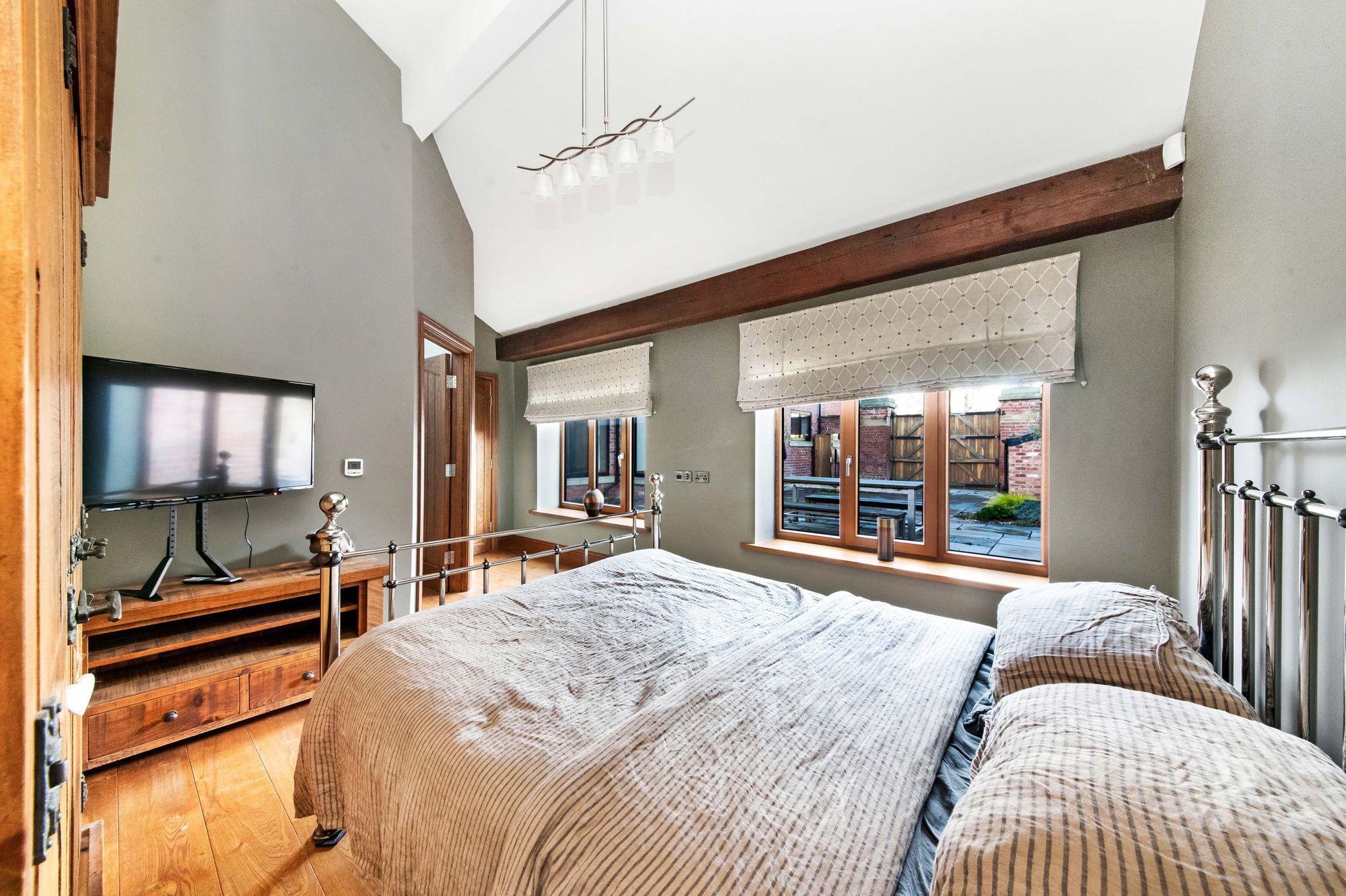 Bedroom two is a pleasant double bedroom with ample space for free standing furniture. It benefits from two banks of Alu-Clad windows to the side elevation which have a pleasant view out to the front courtyard. There is a part vaulted ceiling with an exposed timber beam on display, oak flooring with underfloor heating, central ceiling light point and a door provides access to the en-suite shower room.