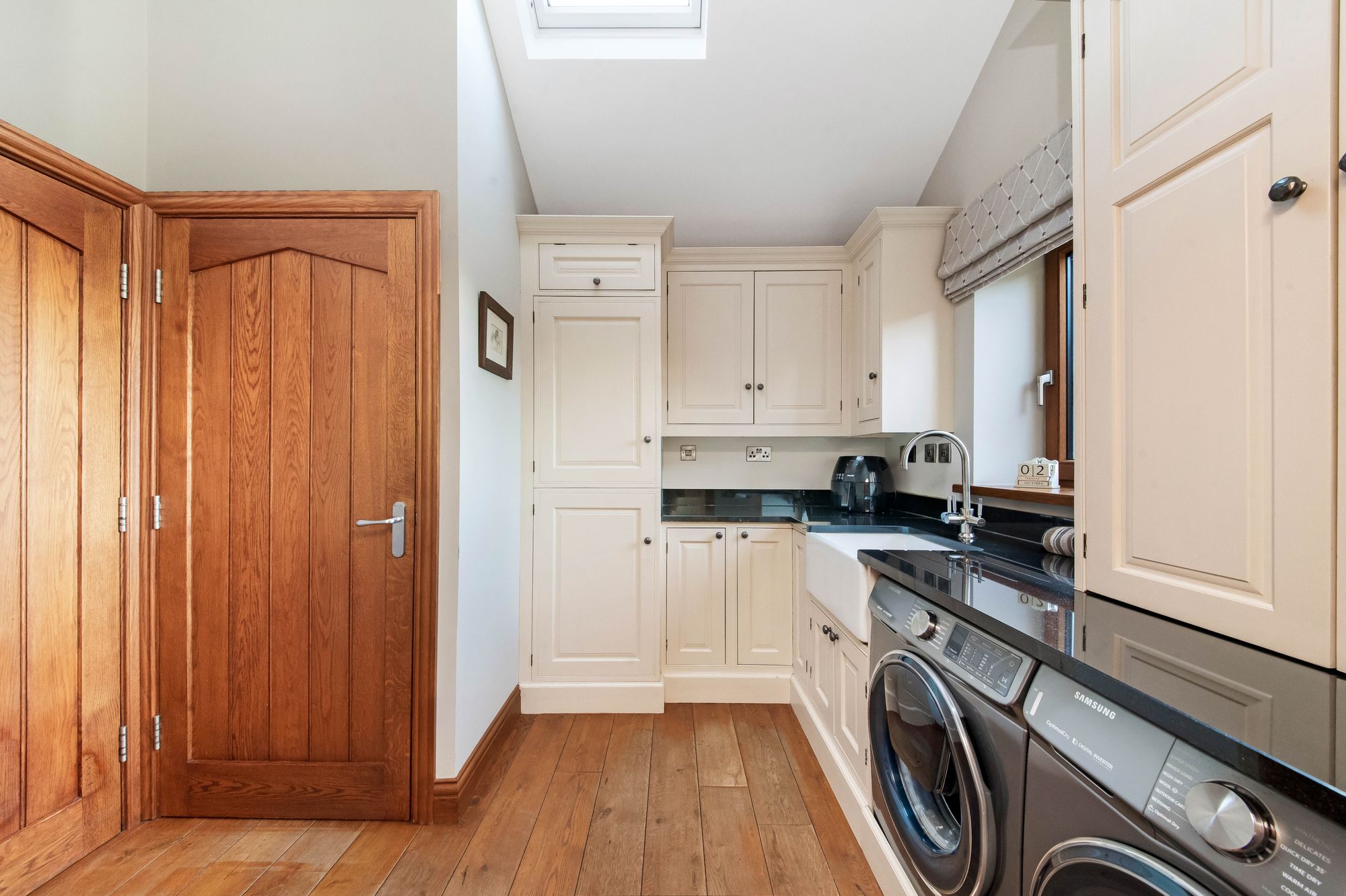 The engineered oak flooring with underfloor heating continues through into the utility room which, again, features high quality solid wood units to the high and low level with fixed frame shaker stye cupboards with complementary granite work surfaces over which incorporates a Franke Belfast sink unit with brushed chrome mixer tap. There is a matching granite upstand to the work surface, provisions for a washing machine, tumble dyer and a integrated tall standing fridge freezer unit. The utility room has a part vaulted ceiling with a ceiling light point, extractor fan, and a double-glazed sky light window to the side elevation. There are doors providing access to the boiler cupboard which houses the wall mounted boiler and the hot water cylinder as well as a door leading into the double integral garage.