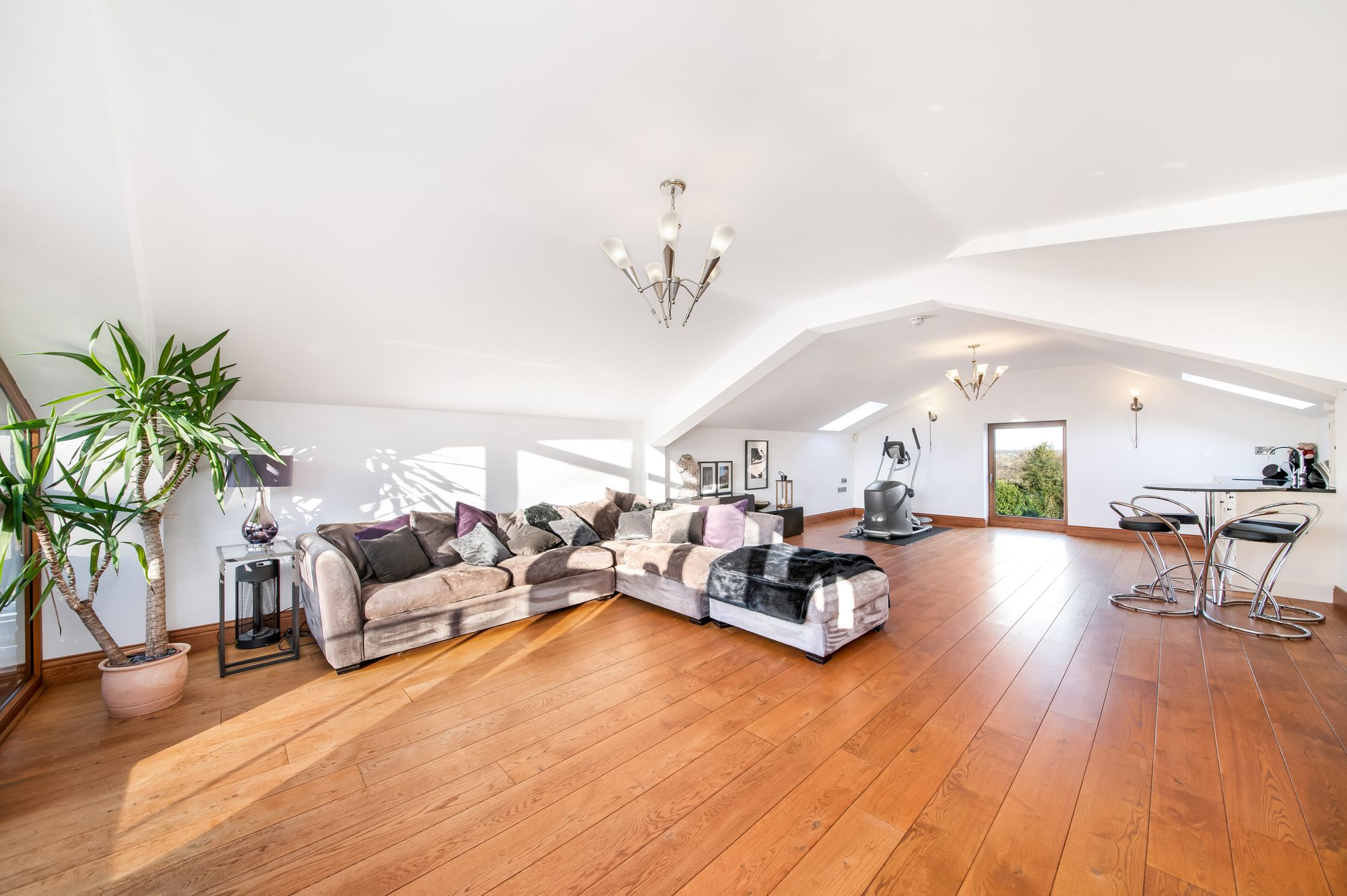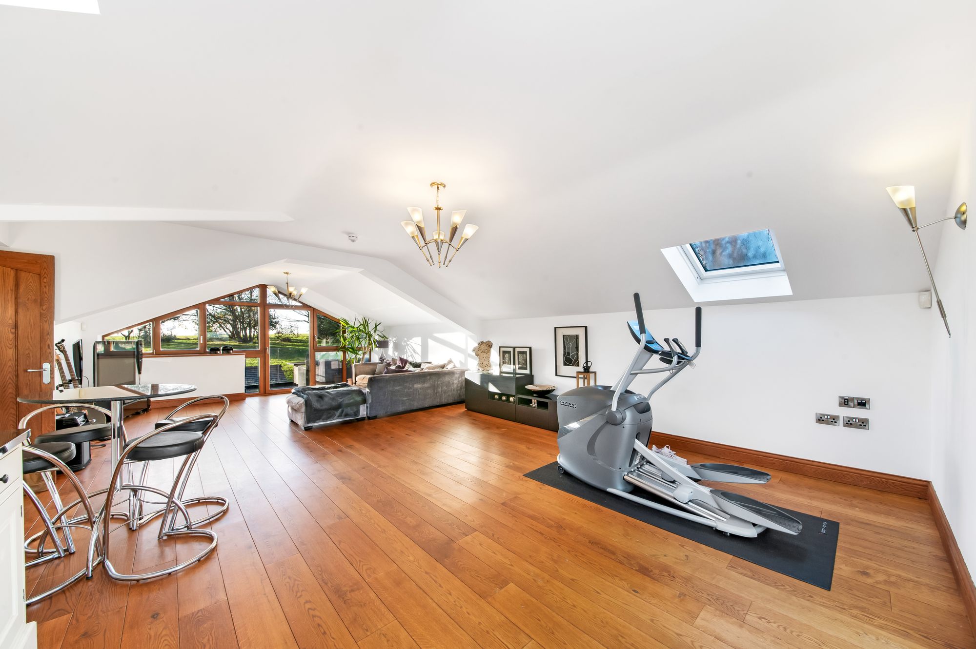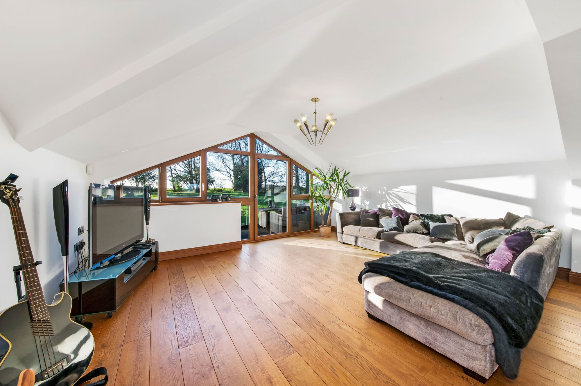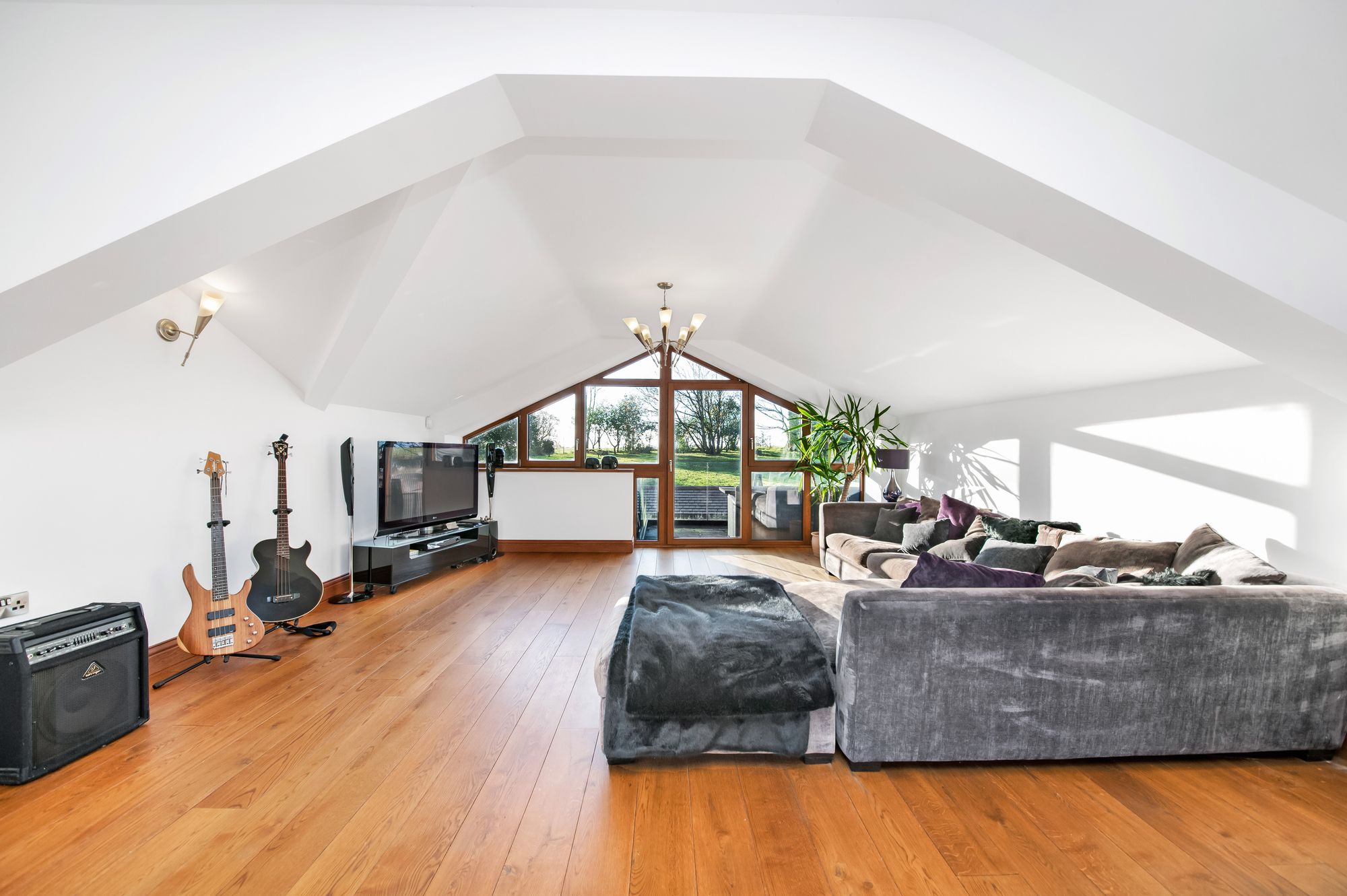 As the photography suggests, the family room is a fabulously proportioned multipurpose room which enjoys a great deal of natural light with a double-glazed tilt and turn window with glazed balustrade to the front elevation which gives superb panoramic views across the valley. There is a double-glazed skylight window with integrated remote blinds and a glazed gable to the rear elevation which takes full advantage of picturesque views across the property’s lawned gardens, tree lined backdrop and of the neighbouring fields beyond. There is a double-glazed tilt and turn window to the rear elevation giving access to the balcony, two skylight windows, two ceiling light points, and four wall light points.