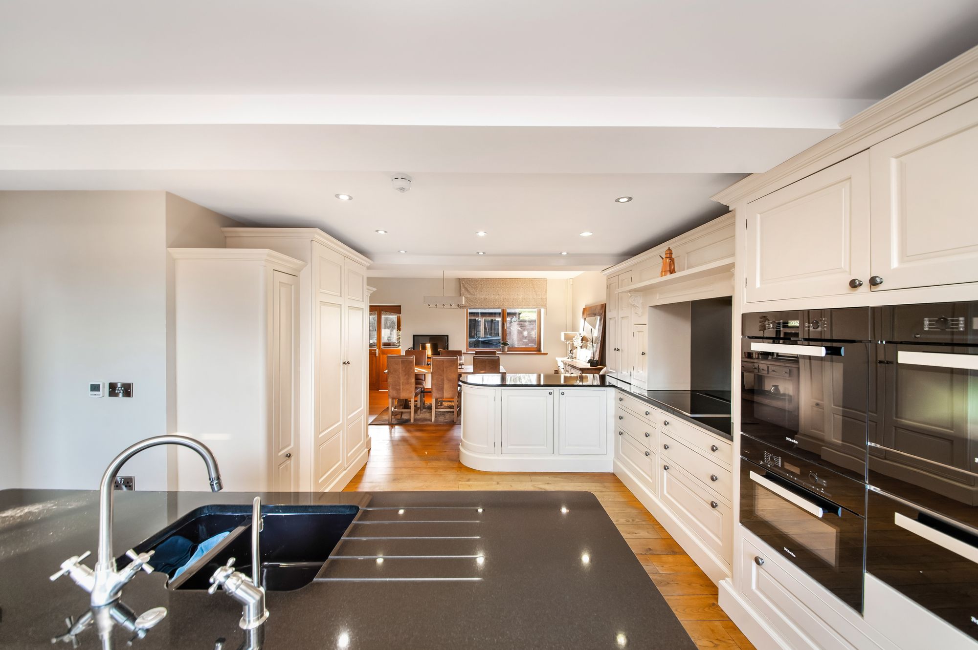 The open plan dining kitchen enjoys a great deal of natural light which cascades through dual aspect banks of Alu-Clad double-glazed windows to both the front and rear elevations. The kitchen area features a high-quality kitchen with units to the high and low levels with fixed frame shaker style cupboard fronts with complementary part granite and part oak work surfaces over. The kitchen is well equipped with high-quality built-in Miele appliances which includes a shoulder level oven, microwave combination oven, warming drawers, and a steam oven. There is a five-ring induction hob with granite splash back and integrated cooker hood above as well as built-in fridge and freezer units. The kitchen benefits from soft closing doors and drawers with glazed display cabinets and bench seating under the windows to the front elevation.
