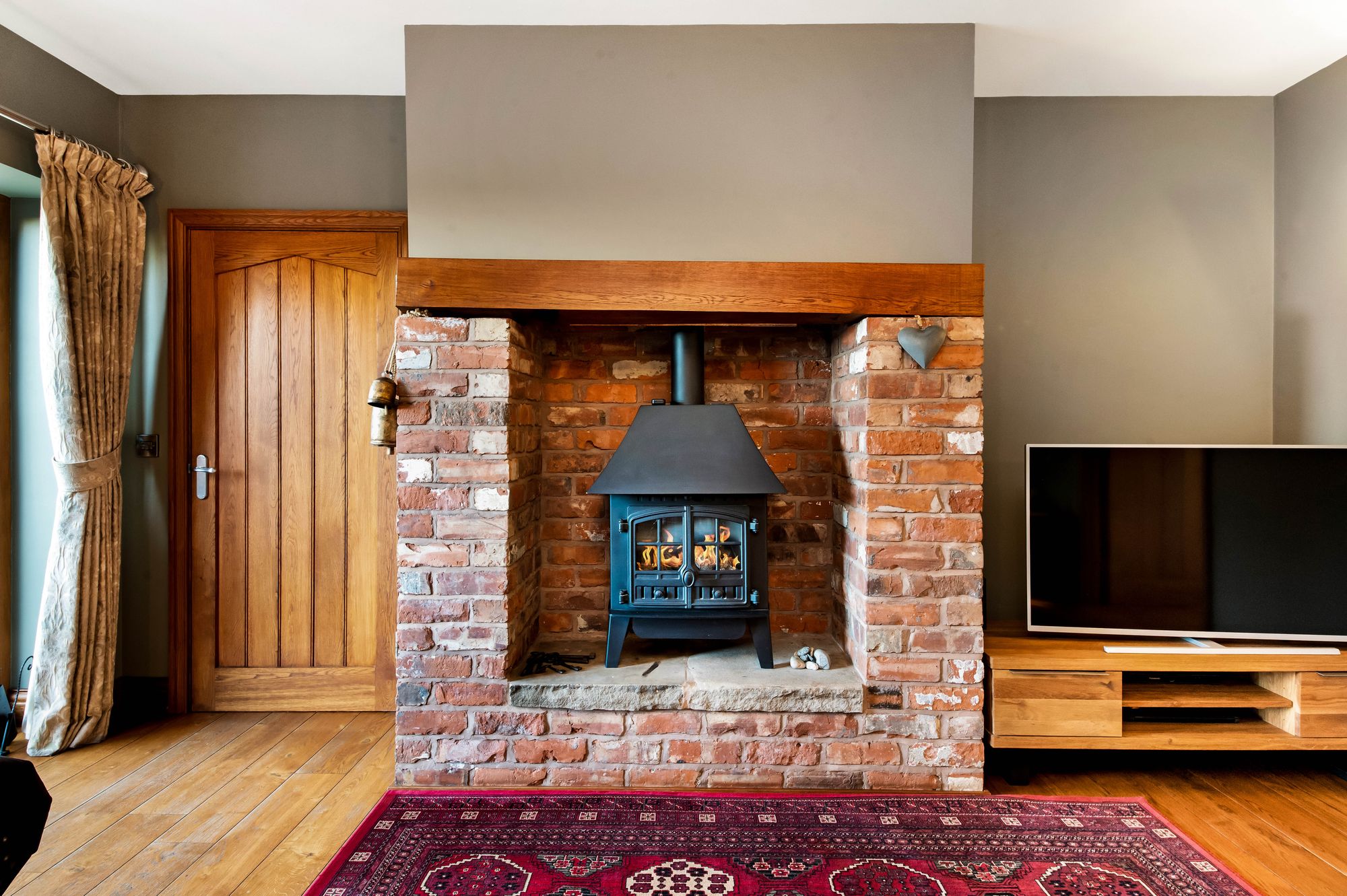 As the photography suggests, the living room is a generously proportioned reception room which enjoys a great deal of natural light with two banks of windows to the front elevation with central tilt and turn panels. There is a central ceiling light point, three wall light points, oak flooring with underfloor heating, doors providing access to the inner hallway and twin doors lead into the garden room. The focal point of the room is the fabulous brick fireplace with a stove effect living flame gas fire which is set upon a raised stone hearth.