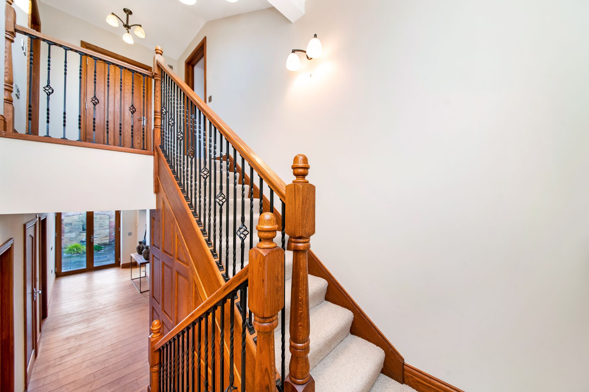 FIRST FLOOR LANDINGTaking the staircase from the entrance hall, you reach the mid-level and first floor landing which features a double-glazed sky light window with integrated blind and remote function to the rear elevation. Mid-level on the staircase rising to the first floor there is a window opening which provides borrowed light to and from the garden/sunroom to the first-floor landing. There are two ceiling light points, two wall light points, a beautiful oak banister with twist spindle cast iron balustrade over the stairwell head and solid oak doors provide access to bedroom three, the first floor W.C. and the family room.