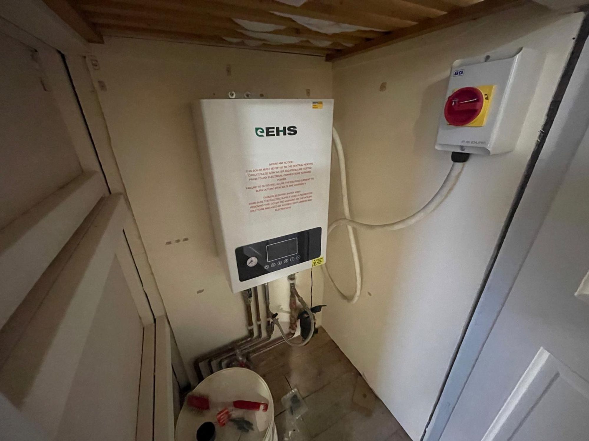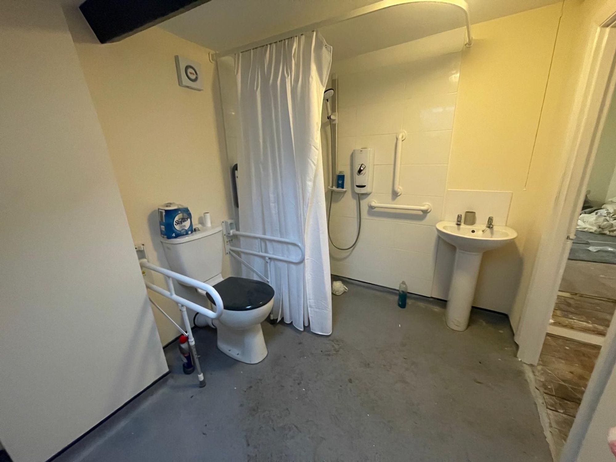 This is a generously proportioned room with a Velux-style window and an exposed ceiling beam. There is an extractor fan and relatively modern, good-quality fittings designed specifically for those with accessibility requirements. The suite comprises a wall-mounted Mira Advance shower with seat, a low-level WC, and a pedestal wash hand basin. The room is finished with high-quality flooring and tiling.