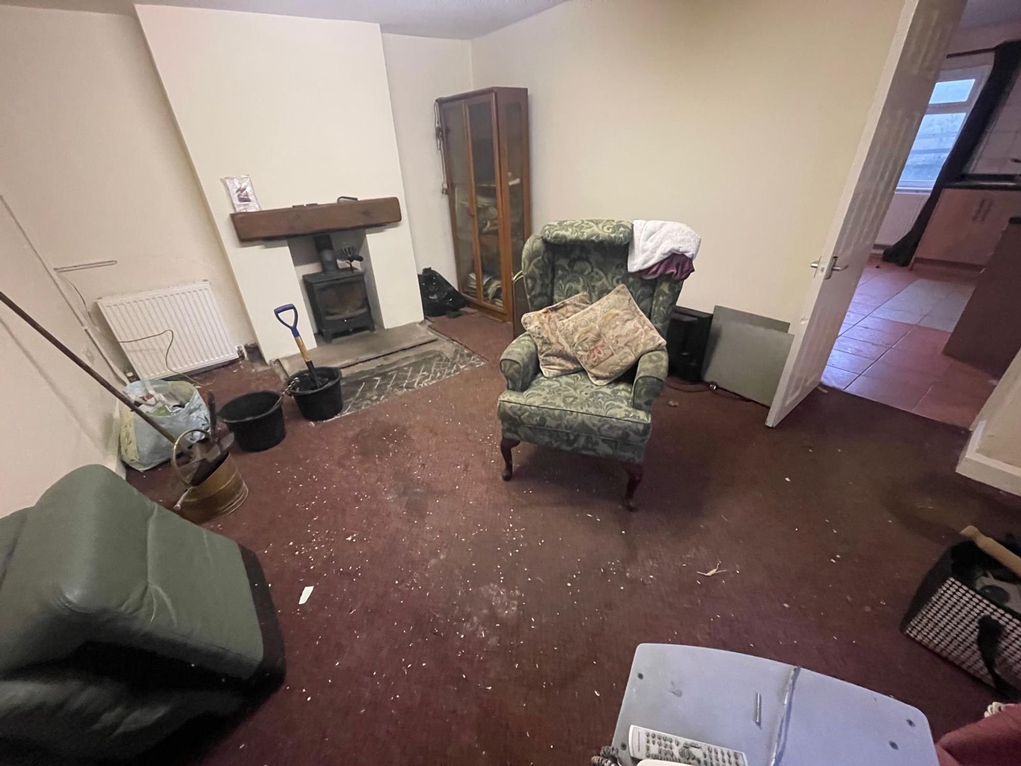 The lounge features a window to the side elevation, and an external door provides access to the side and the gardens beyond. There is a central ceiling light point and a wood-burning stove set on a raised flagged hearth with a timber mantel above.