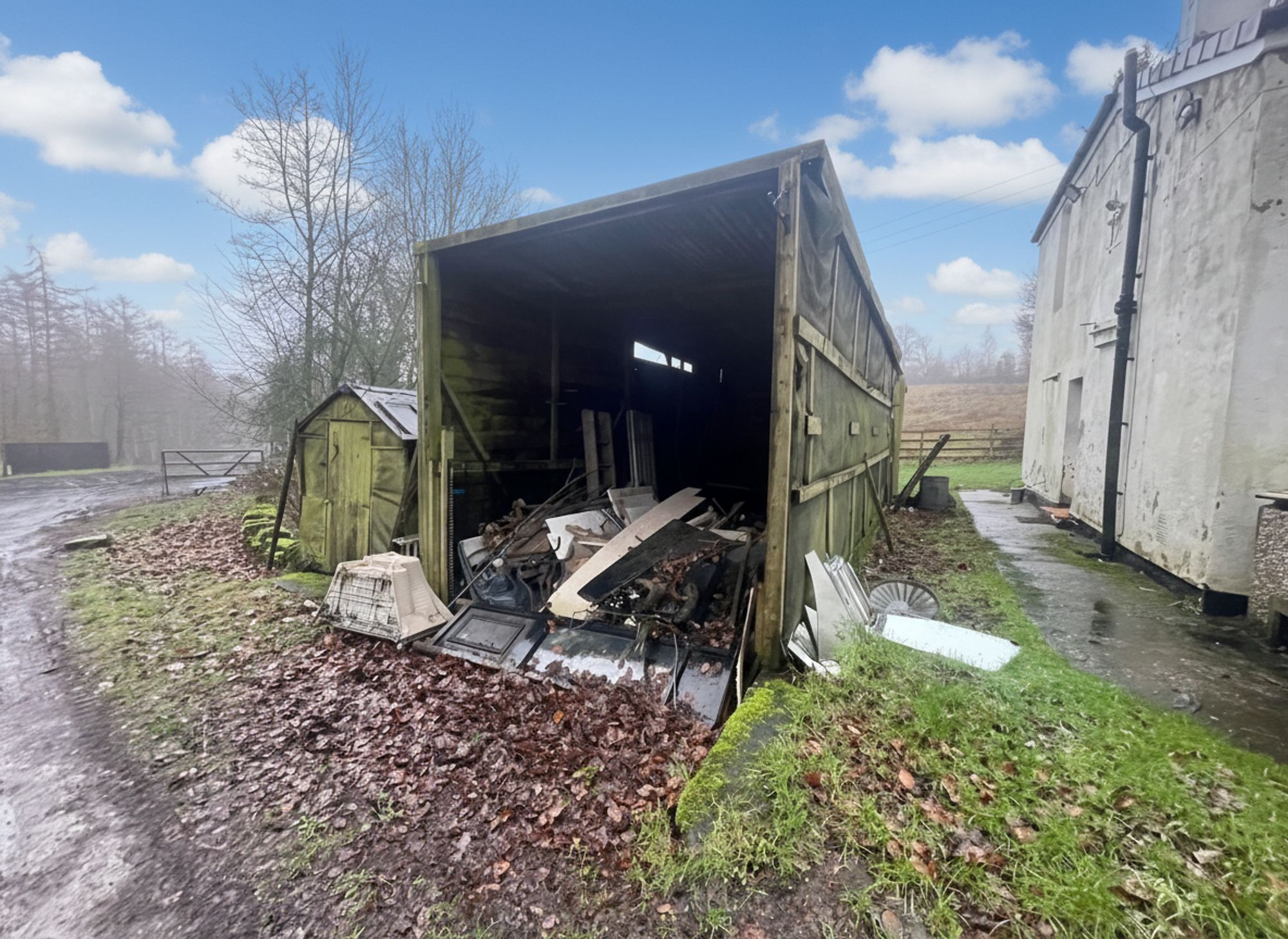 The accommodation briefly comprises a dining kitchen, lounge with woodburning stove, first-floor bedroom, secondary bedroom, nursery, and home office, which also gives access to the bathroom/wet room. There is an attached outbuilding providing potential, along with other buildings including a chicken shed, greenhouse, and large garage with kennels to the rear.