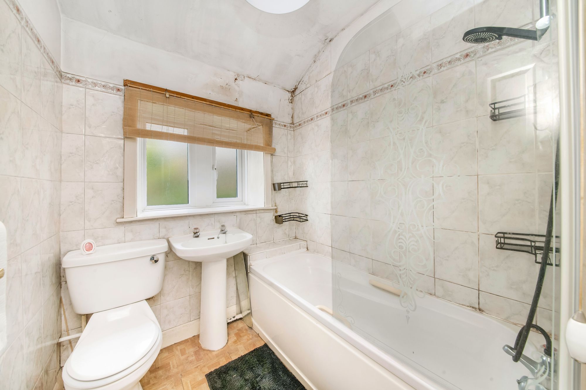 The house bathroom features a white, three-piece suite comprising a panel bath with showerhead mixer tap and glazed shower guard, a pedestal wash hand basin, and a low-level WC with push-button flush. There is vinyl tiled flooring, tiling to the walls and splash areas, a ceiling light point, a radiator, and a bank of double-glazed windows with obscure glass and central mullion to the rear elevation.