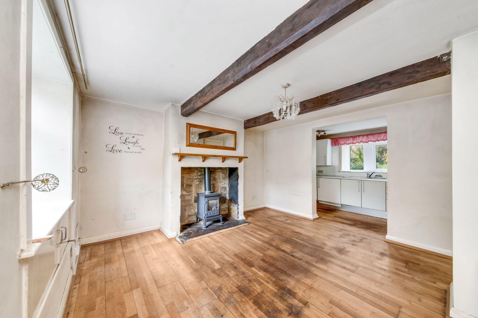 Enter into the property through a PVC front door into the lounge. The lounge features hardwood flooring, exposed timber beams to the ceiling, a staircase with wooden banister and spindle balustrade rising to the first floor, two ceiling light points, two radiators, a double-glazed hardwood window to the front elevation with storage cupboard beneath, and television and telephone points. A doorway leads into the kitchen and a multi-panel door encloses a useful understairs cupboard. The focal point of the room is the inglenook stone fireplace with cast-iron, living-flame-effect fire set upon a raised stone hearth.