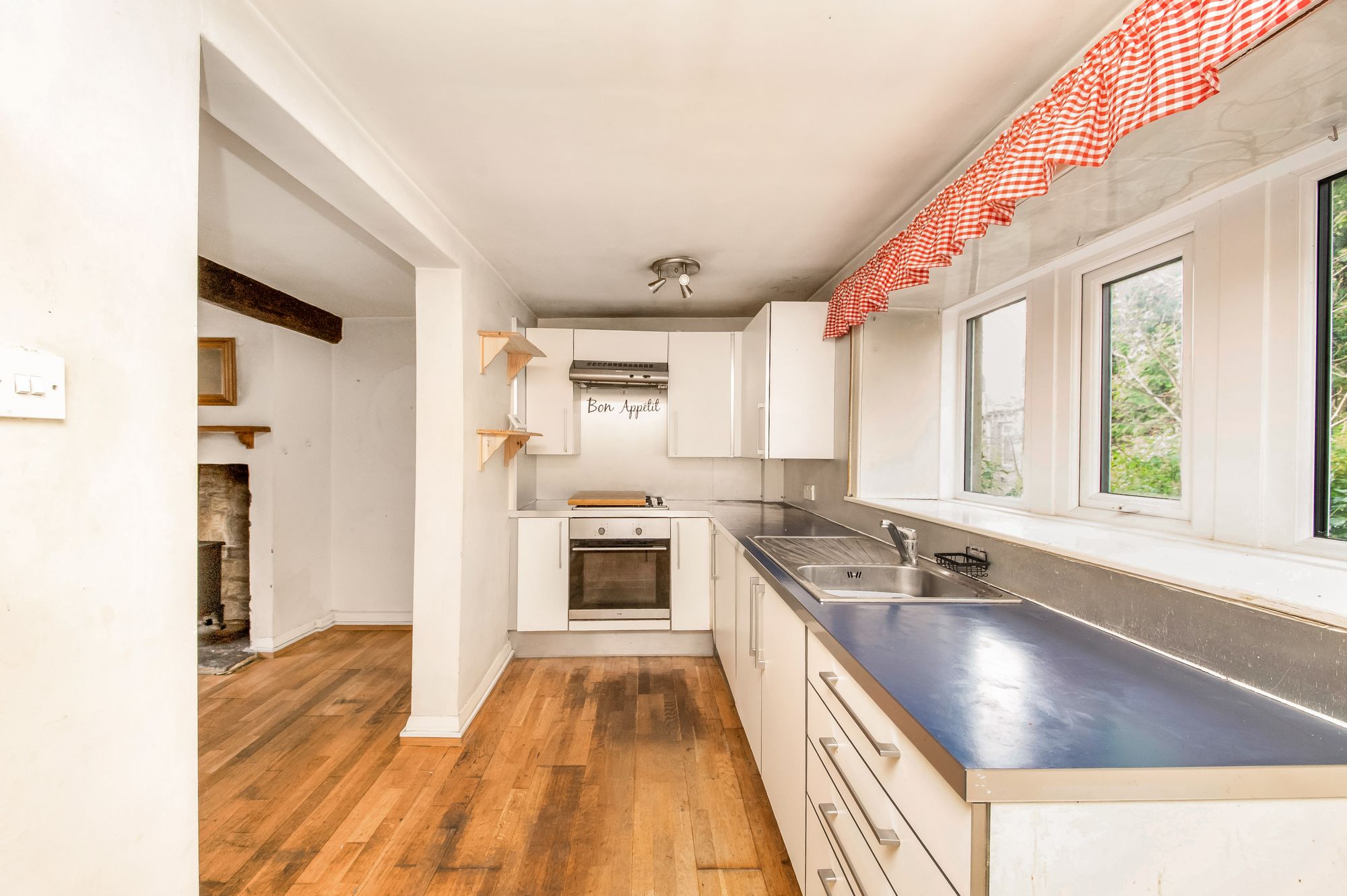 The kitchen features a range of fitted wall and base units with work surfaces over, which incorporate a single-bowl, stainless-steel sink and drainer unit with chrome mixer tap. There are built-in appliances including a four ring Smeg gas hob with Smeg cooker hood over, an electric fan-assisted oven, an under-counter fridge unit, and space for a tall-standing fridge freezer unit. The kitchen also features a bank of double-glazed mullion windows to the rear elevation, two ceiling light points, a radiator, fitted shelving, and oak flooring.