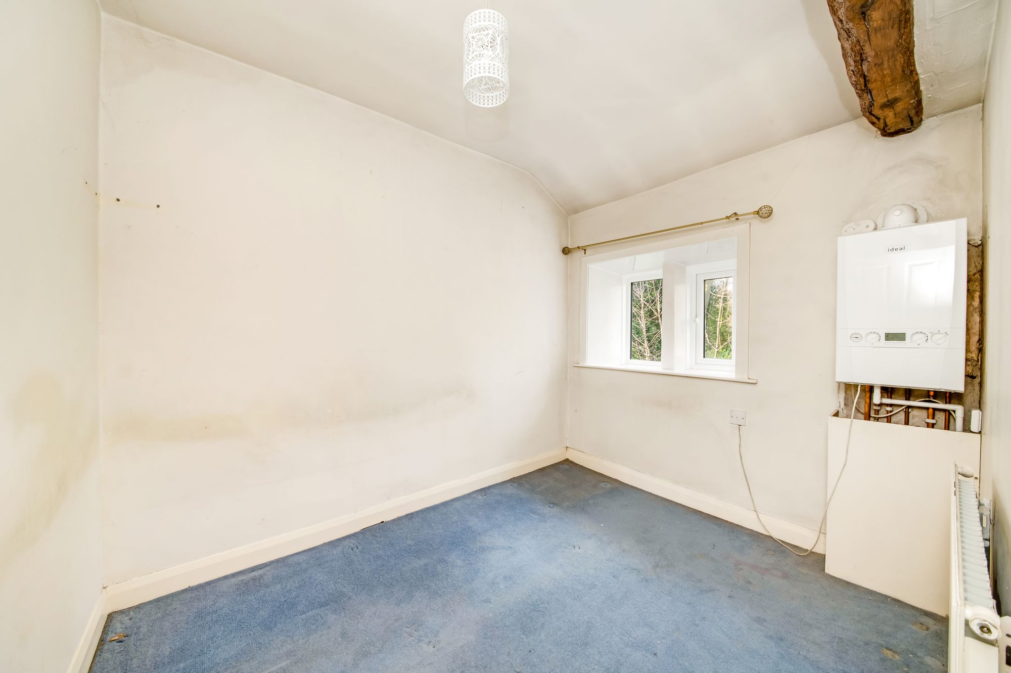Bedroom two is situated to the rear of the property and features a bank of double-glazed mullion windows offering a pleasant view across neighbouring gardens and with a tree-lined outlook. There is a ceiling light point, a radiator, a partly exposed timber beam to the ceiling, and it also houses the wall-mounted combination boiler.