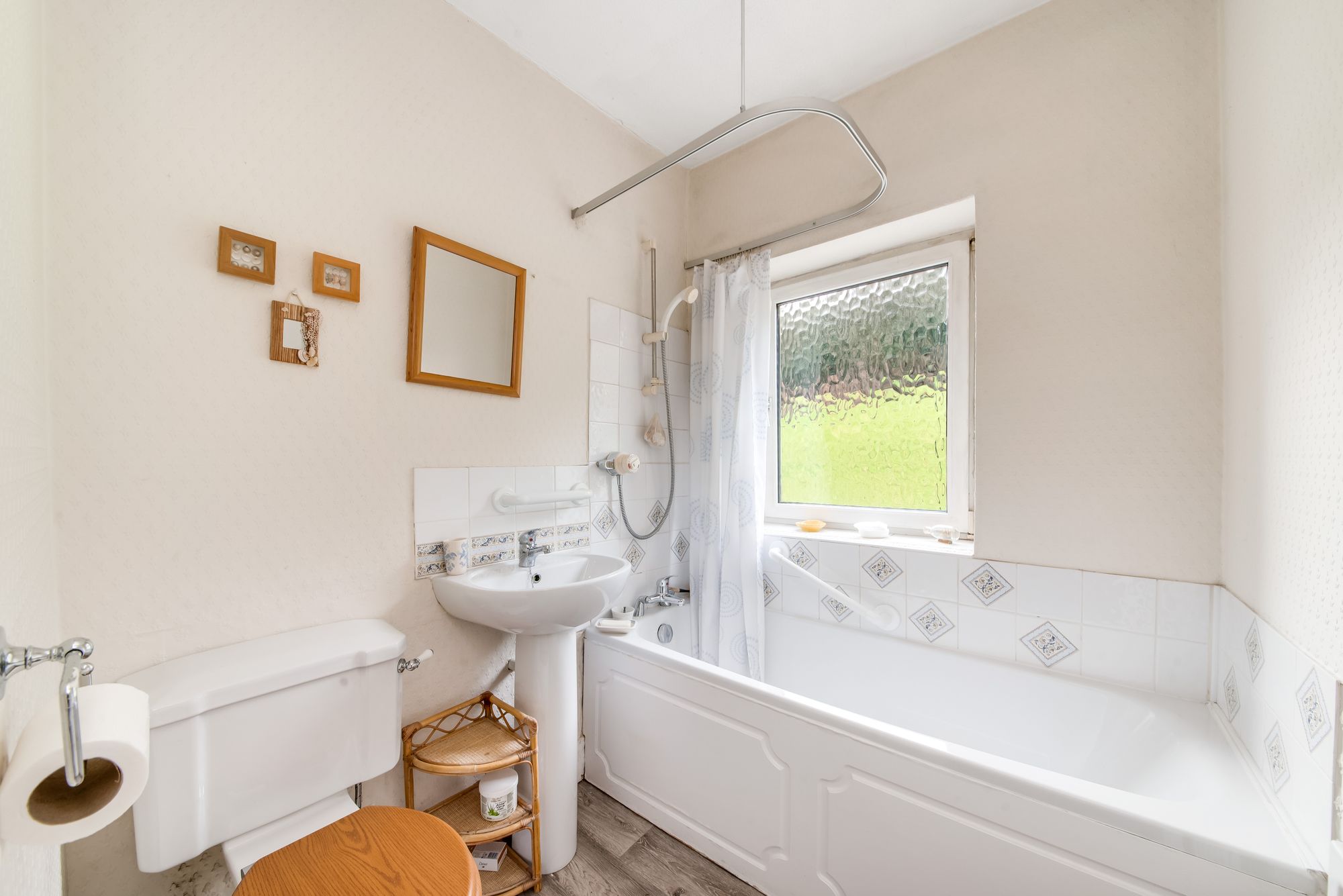 The bathroom features a white three-piece suite, which comprises panel bath with Myra XL shower over, a pedestal wash hand basin with chrome monobloc mixer tap and a low level w.c. There is tiling to the splash areas, a double-glazed window with obscure glass and tiled sill to the front elevation, a ceiling light point and radiator.