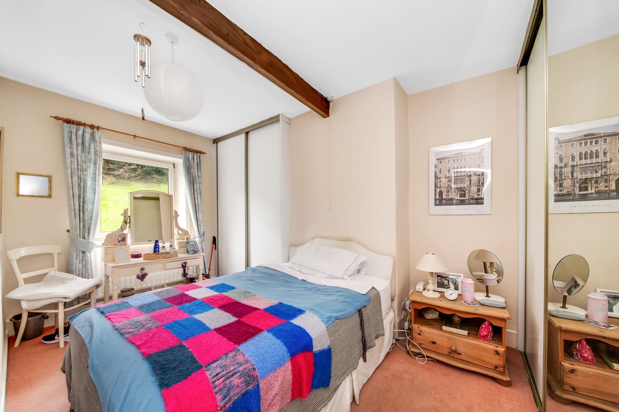 Taking the carpeted stone staircase from the entrance, you reach the first-floor landing, which has doors providing access to two bedrooms and the bathroom. There are two ceiling light points, an exposed timber beam to the ceiling, a loft hatch which gives access to a useful attic space and there is a single glazed window above the bathroom door that provides borrowed light into the landing.