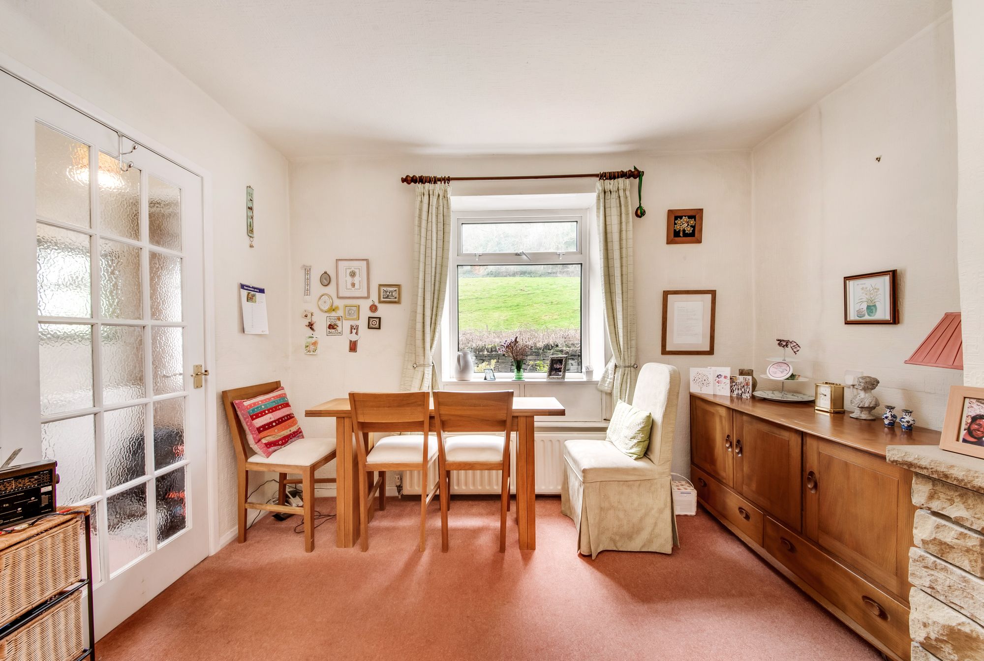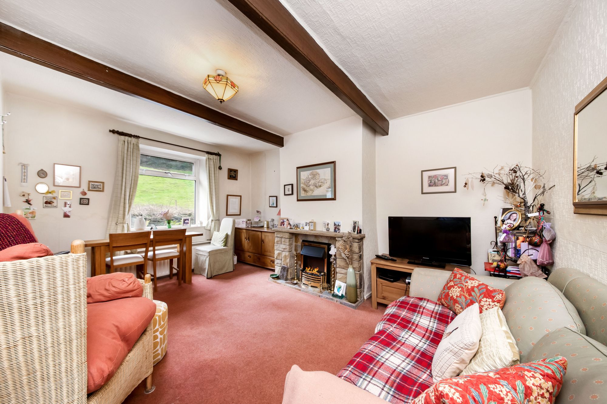 The open plan living dining room is a generous proportioned reception room which features a double-glazed window to the front elevation with pleasant open aspect view across a neighbouring field and with a tree lined backdrop. There are exposed timber beams to the ceiling, two radiators, a central ceiling light point, and the focal point of the room is the electric fireplace with a natural slate inset and hearth and with decorative stone surround. A door then encloses the staircase which descends to the lower ground floor.