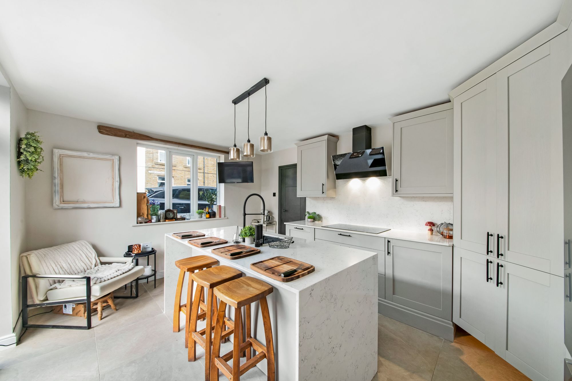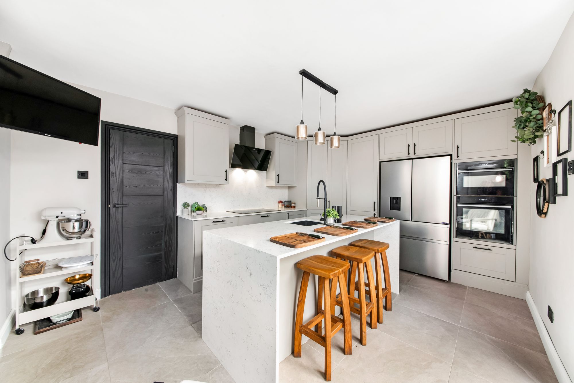 The dining kitchen enjoys a wealth of natural light cascading through windows to the front and double-glazed patio doors to the side, which also give access to the patio. The kitchen features a range of high-quality, fitted wall and base units with shaker-style cupboard fronts and complementary quartz work surfaces over, which incorporate an inset, composite sink unit with pull-out hose mixer tap. Integrated appliances include a Schott Ceran induction hob with NEFF cooker hood, a slide-and-hide, waist-level NEFF oven, a shoulder-level microwave oven, a slide-and-hide bin store, a dishwasher, and space for an American-style fridge freezer. The kitchen also benefits from attractive tiled flooring, central ceiling light point, radiator, matching quartz upstand, soft-closing doors and drawers, fabulous breakfast island with waterfall quartz top, and a fantastic walk-in larder with shelving, housing the wall-mounted combi boiler, and a staircase descending to the lower ground floor.