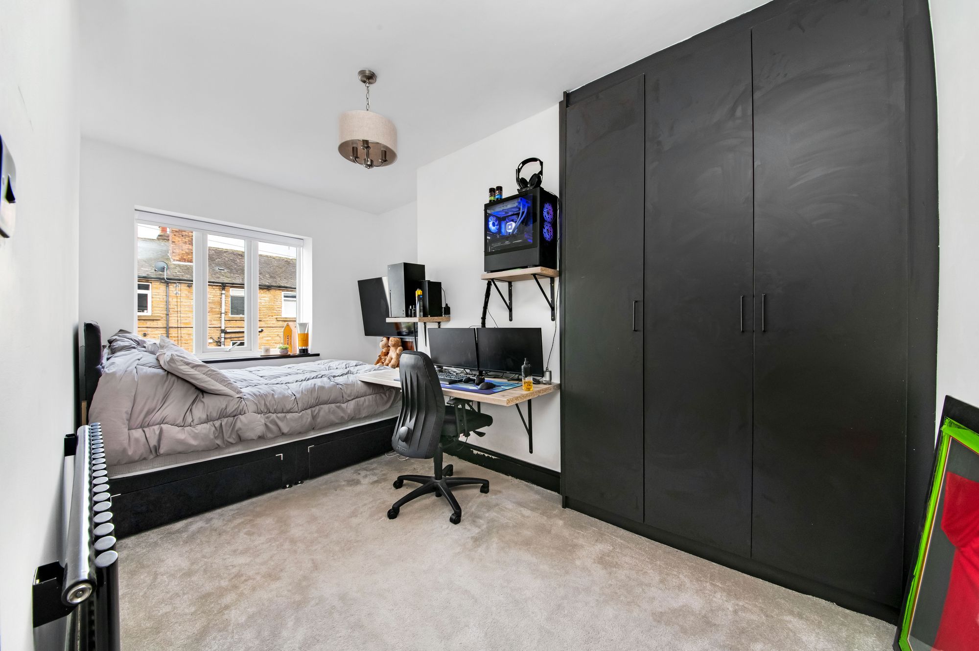Bedroom two is another light and airy double bedroom which features dual-aspect, double-glazed windows to the front and side elevations. There is ample space for freestanding furniture, a ceiling light point, a cast-iron column radiator, and a bank of floor-to-ceiling, fitted wardrobes with hanging rails, shelving and drawer units in situ.