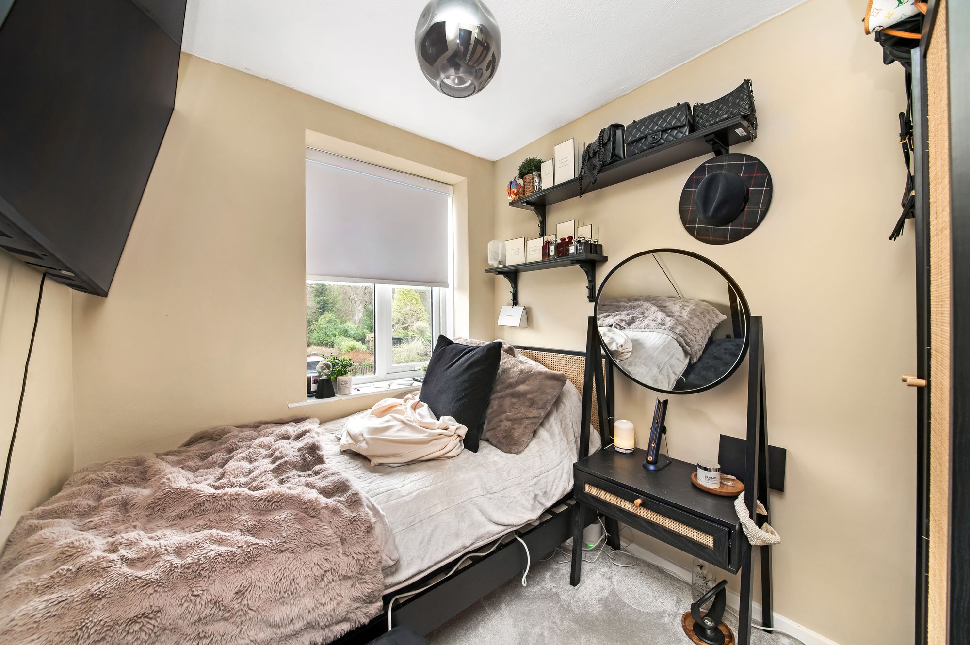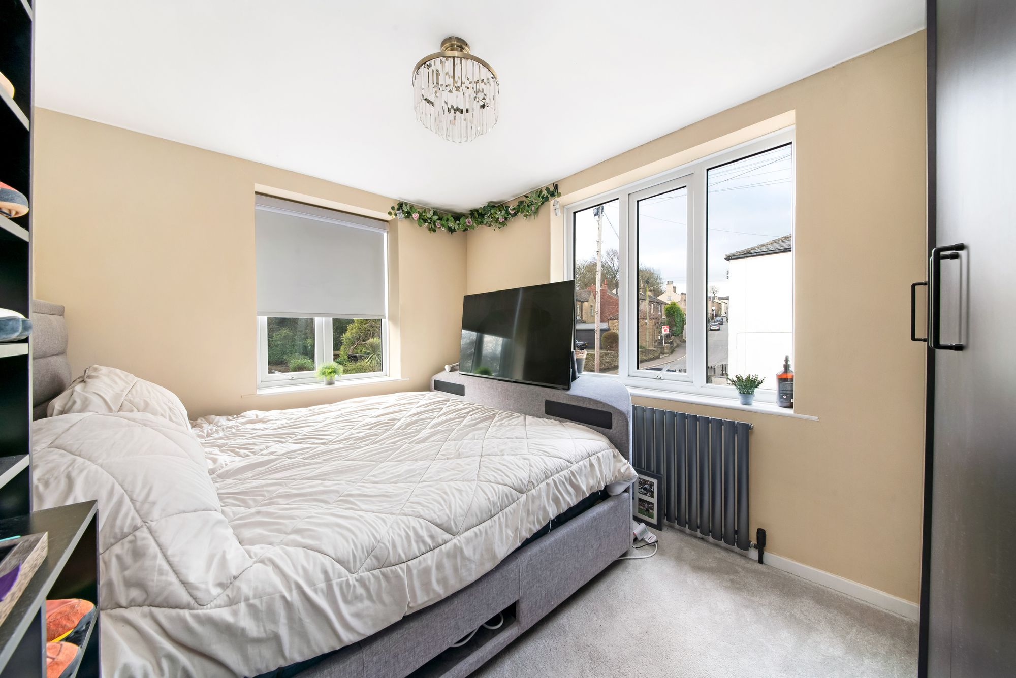 Bedroom three can accommodate a single bed or three-quarter bed with space for freestanding furniture. There is a bank of double-glazed windows to the side elevation with pleasant views onto the gardens, a central ceiling light point, and a cast-iron column radiator.