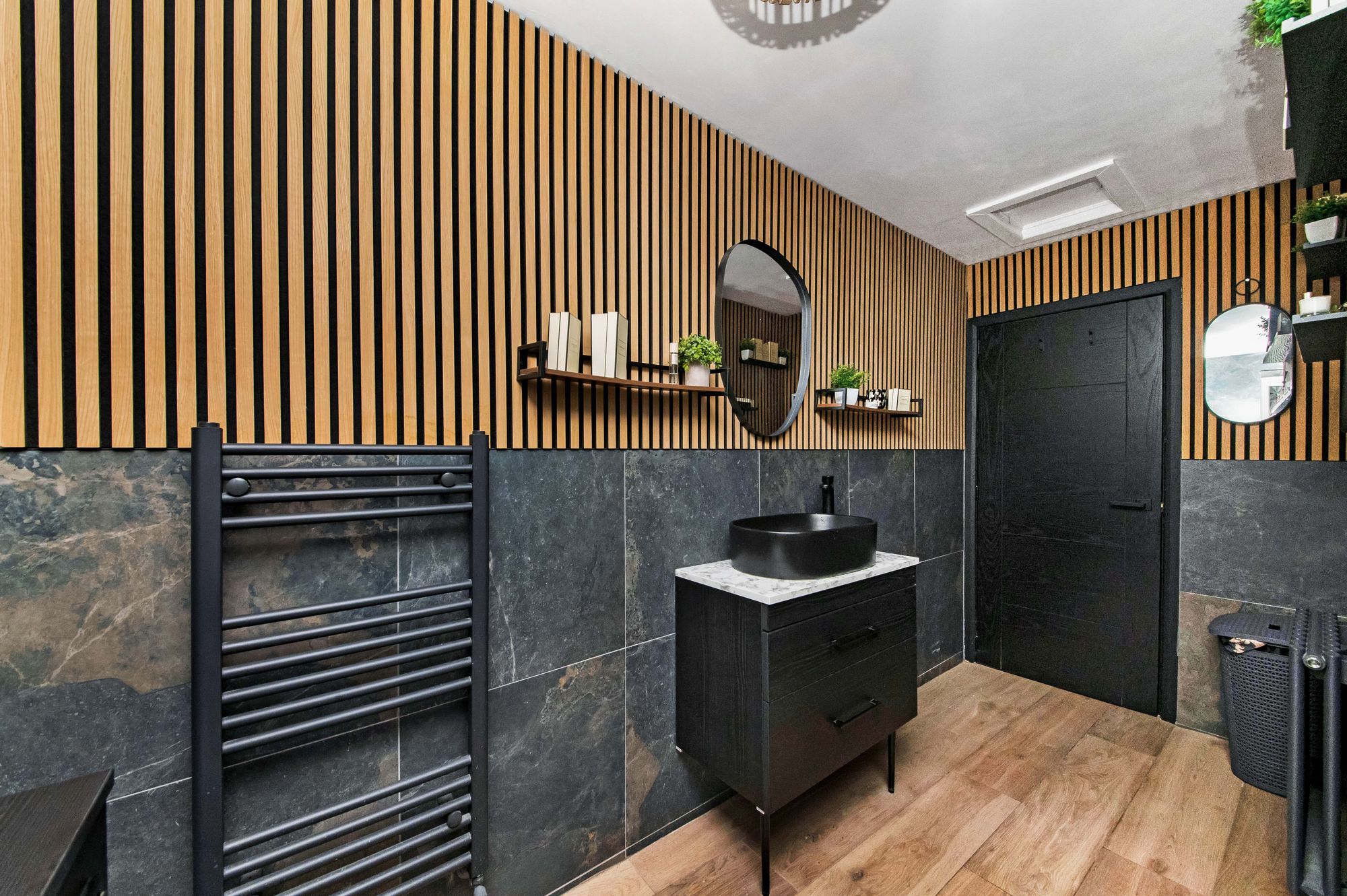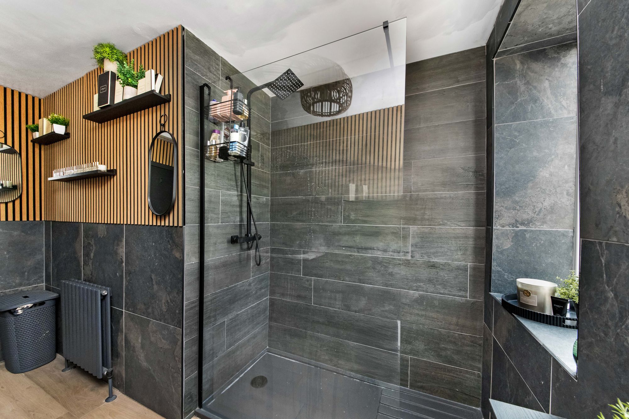 The luxury house shower room is sure to impress, boasting a fabulous, three-piece suite comprising a walk-in, fixed frame shower with thermostatic rainfall showerhead and separate handheld attachment, a low-level WC with concealed cistern and push-button flush, and a fabulous oval wash hand basin set upon a bespoke vanity unit with chrome mixer tap. There is attractive tiled flooring, contrasting tiling and panelling to the walls, a ceiling light point, an extractor fan, a ladder-style radiator, a column radiator, a loft hatch providing access to a useful attic space, and a bank of double-glazed windows with obscure glass to the front elevation.