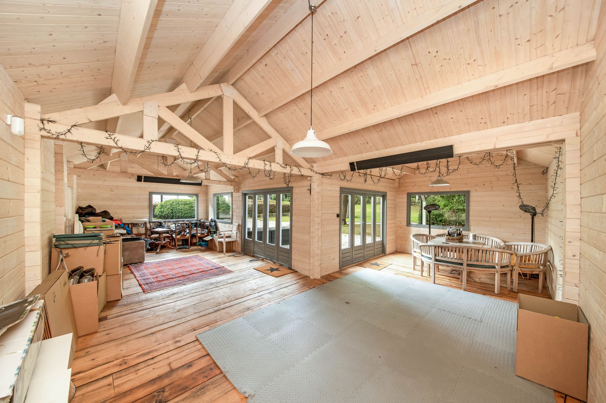Further lobby gives access to a secondary staircase, which rises up to an entertainment room stroke gym. This, as the photograph suggests, is superbly presented and has a variety of windows, beams on display, inset spotlighting to the ceiling. It is presented with two areas, both with a good amount of space.