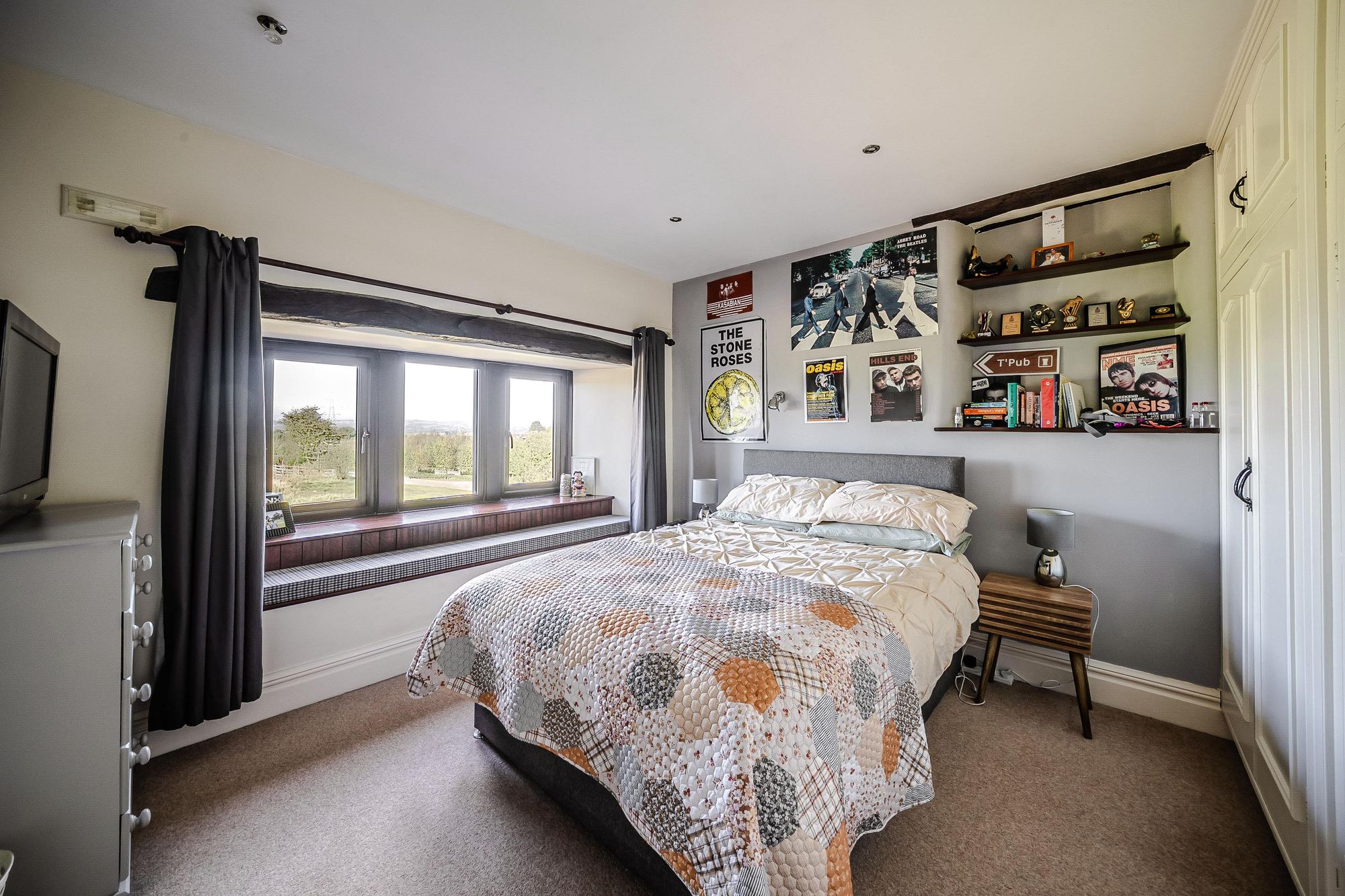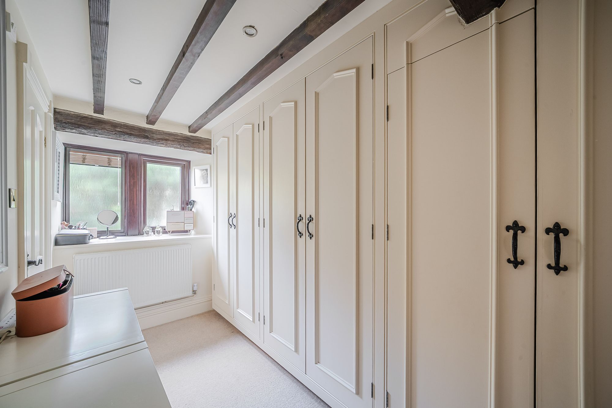 Bedroom FiveBedroom 5 is a light and airy double bedroom which has ample space for freestanding furniture. There is a bank of double glazed mullioned windows to the front elevation with window seat beneath, again taking full advantage of fantastic open aspect views across open countryside. There is a partly exposed timber beam on display, inset spotlighting to the ceilings, a radiator and a bank of fitted wardrobes which have hanging rails and shelving and cupboards for additional storage over.