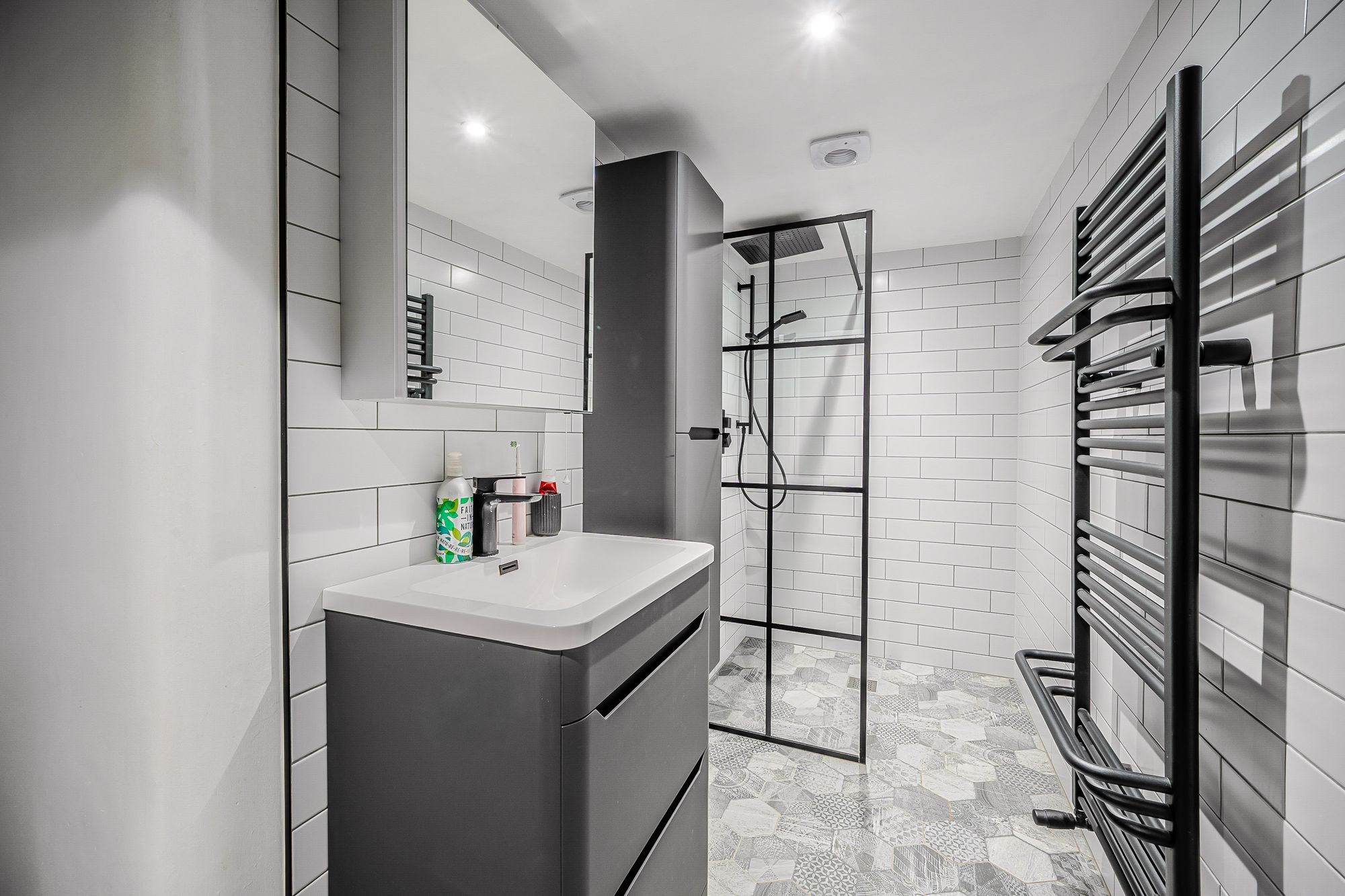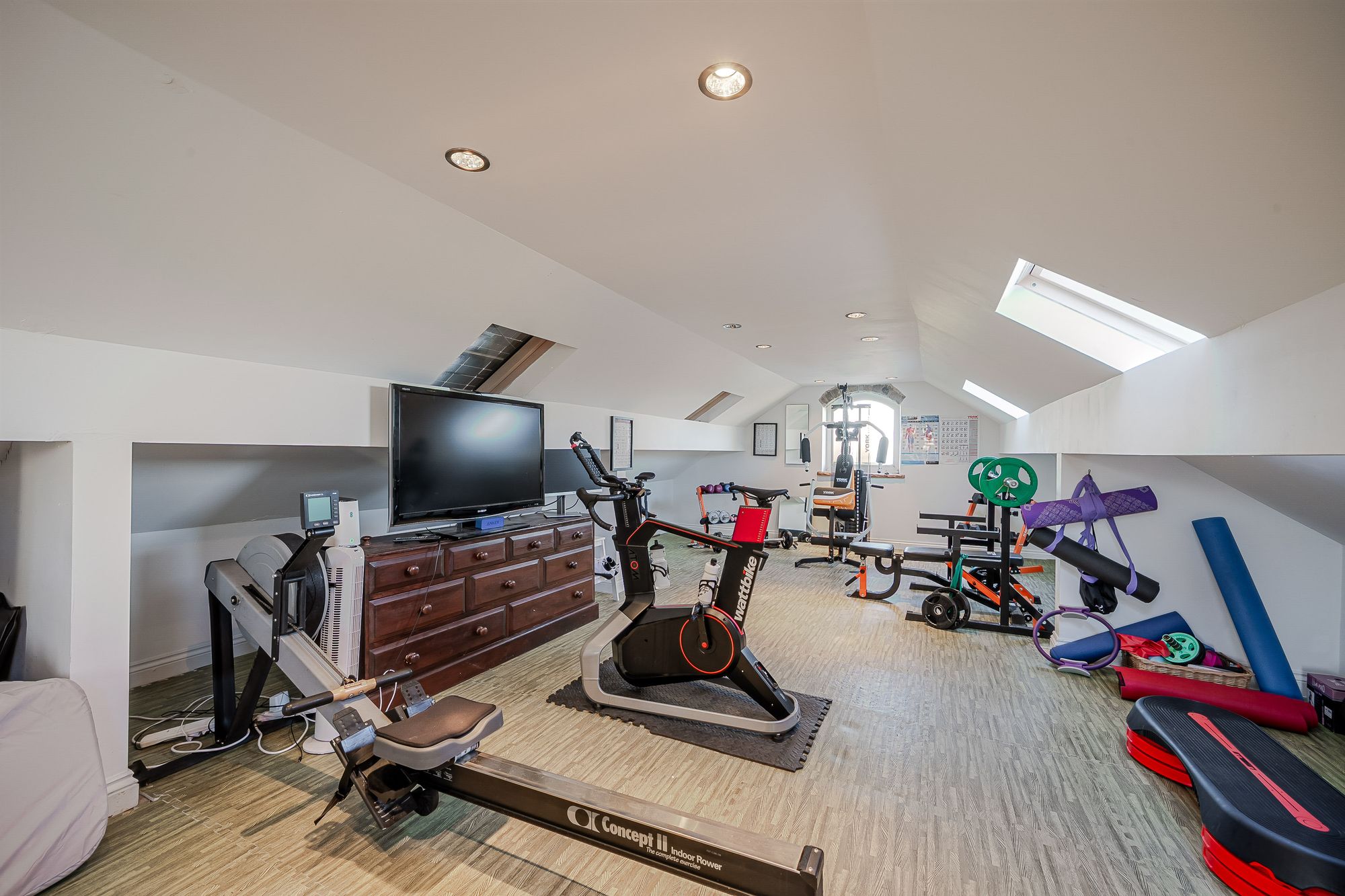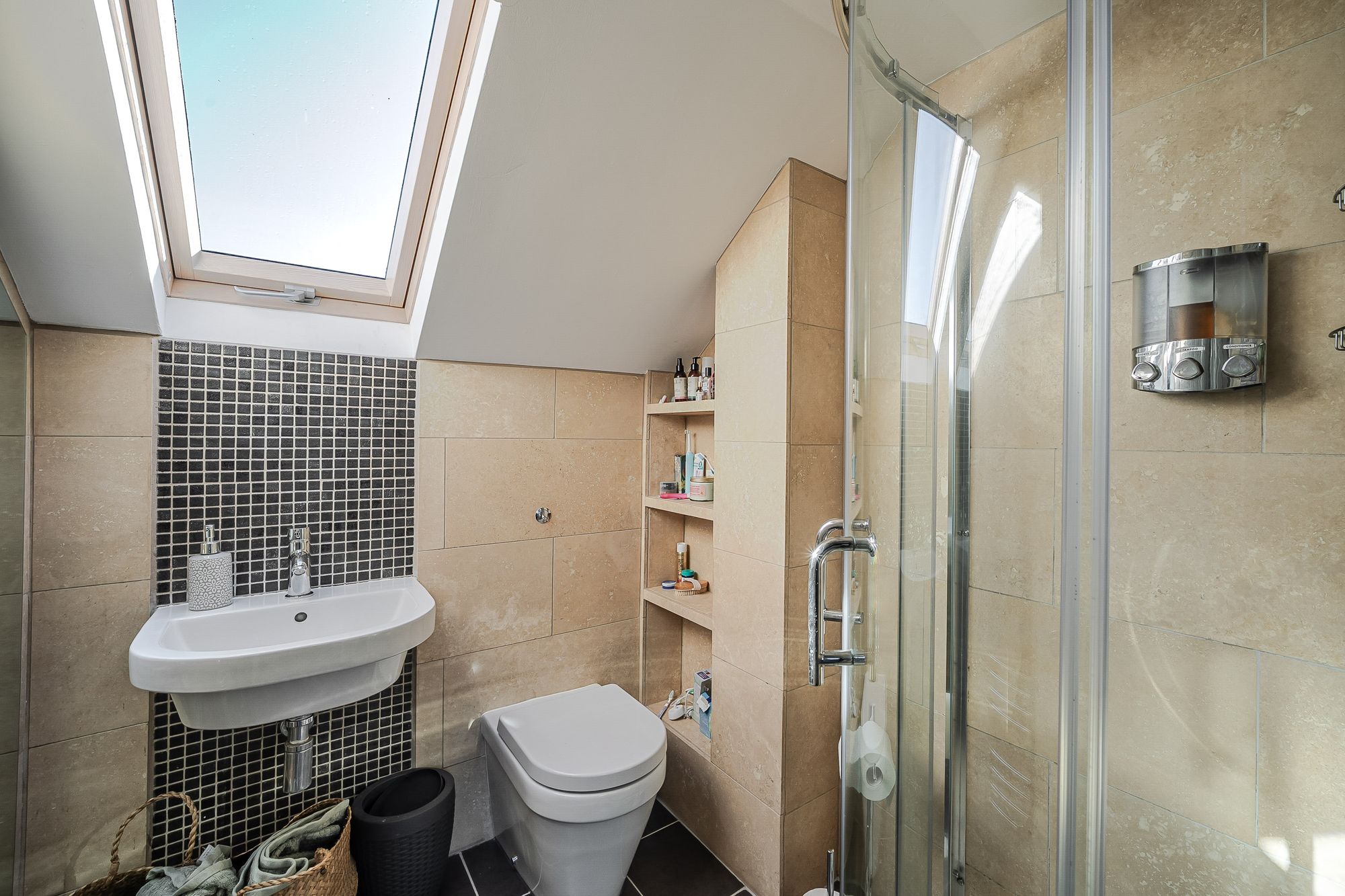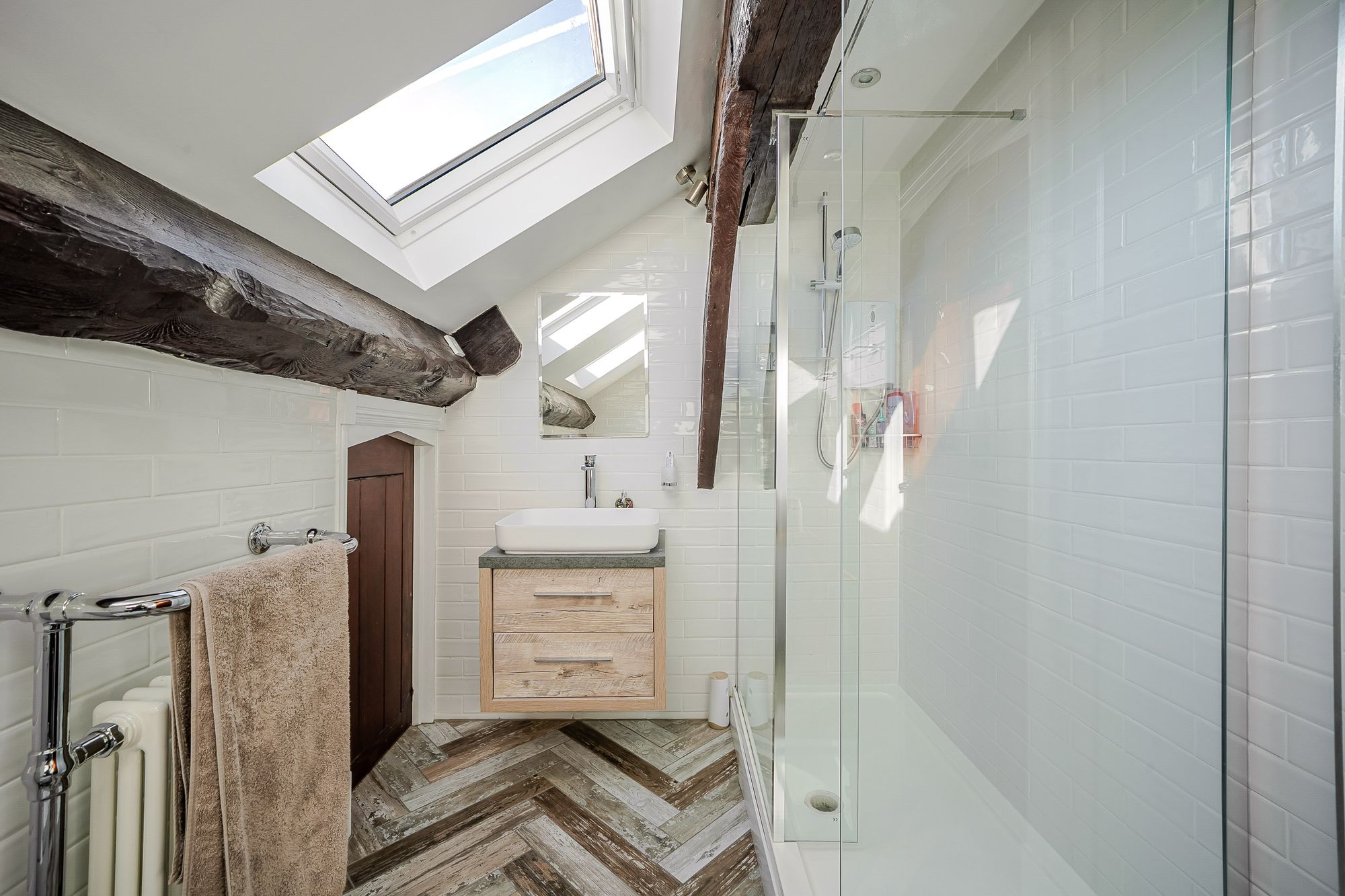 BathroomThe bathroom features a modern contemporary four-piece suite which comprises of a fixed frame walk-in shower with electric MiraSport shower, a broad wash hand basin set upon a floating vanity unit with chrome mixer tap, a low level WC with push button flush and a double-ended panel bath with shower head mixer tap. There is attractive herringbone style tiling to the flooring, high gloss brick effect tiling to the walls, inset spotlight into the ceilings, as well as three ceiling light points and an extractor fan. Additionally, there are two double-glazed skylight windows to the front elevation, a vertical column radiator with chrome towel rail, and a door which encloses a useful under eave storage area.